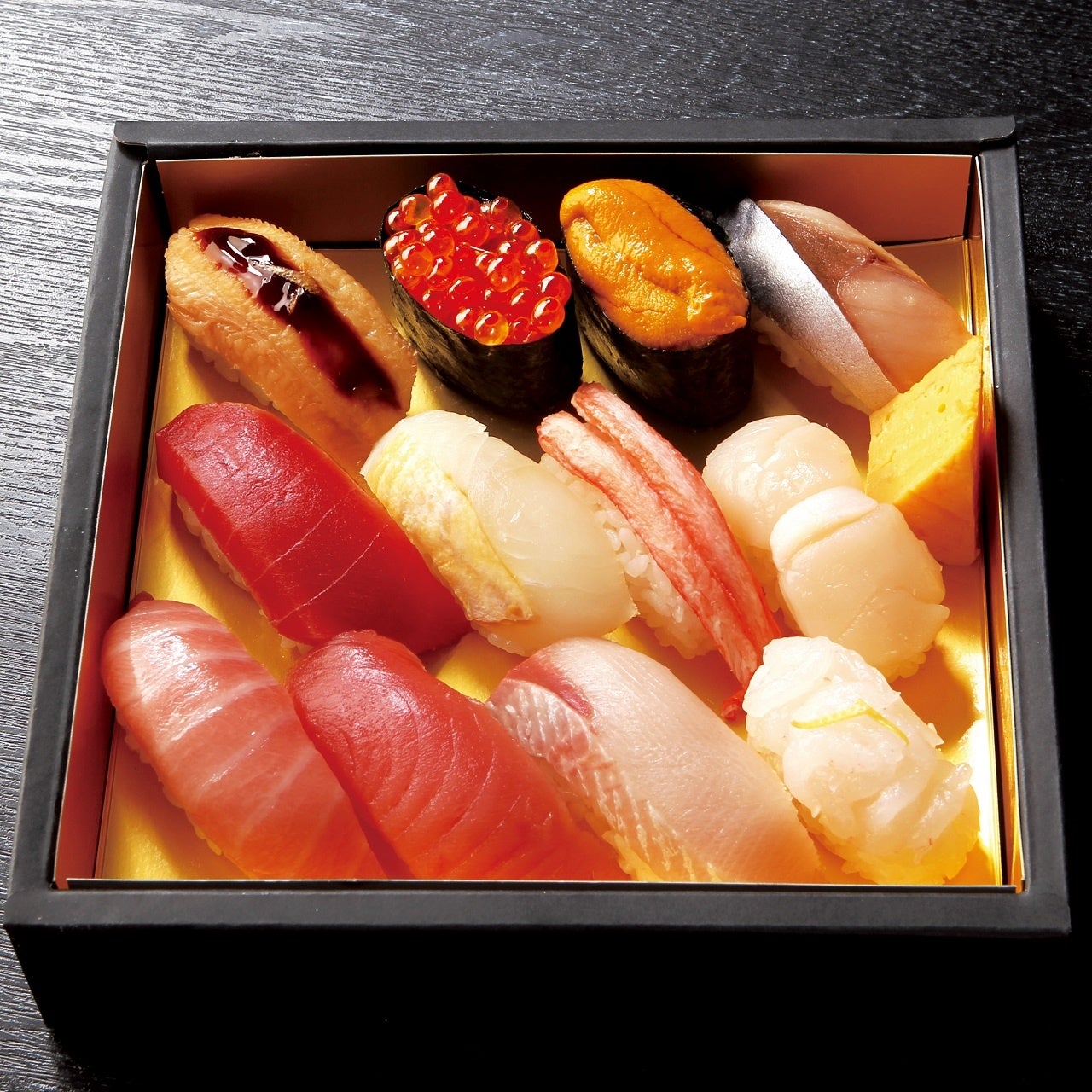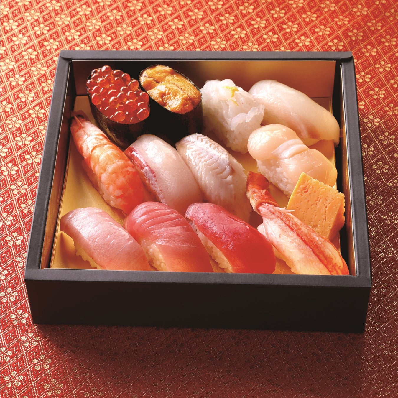 【内容】大とろ・中とろ・まぐろ赤身・生うに・いくら・紅ずわいがに・ほたて・寒ぶり・平目昆布〆・金華さば・柚子ふり穴子・白海老・切り玉子