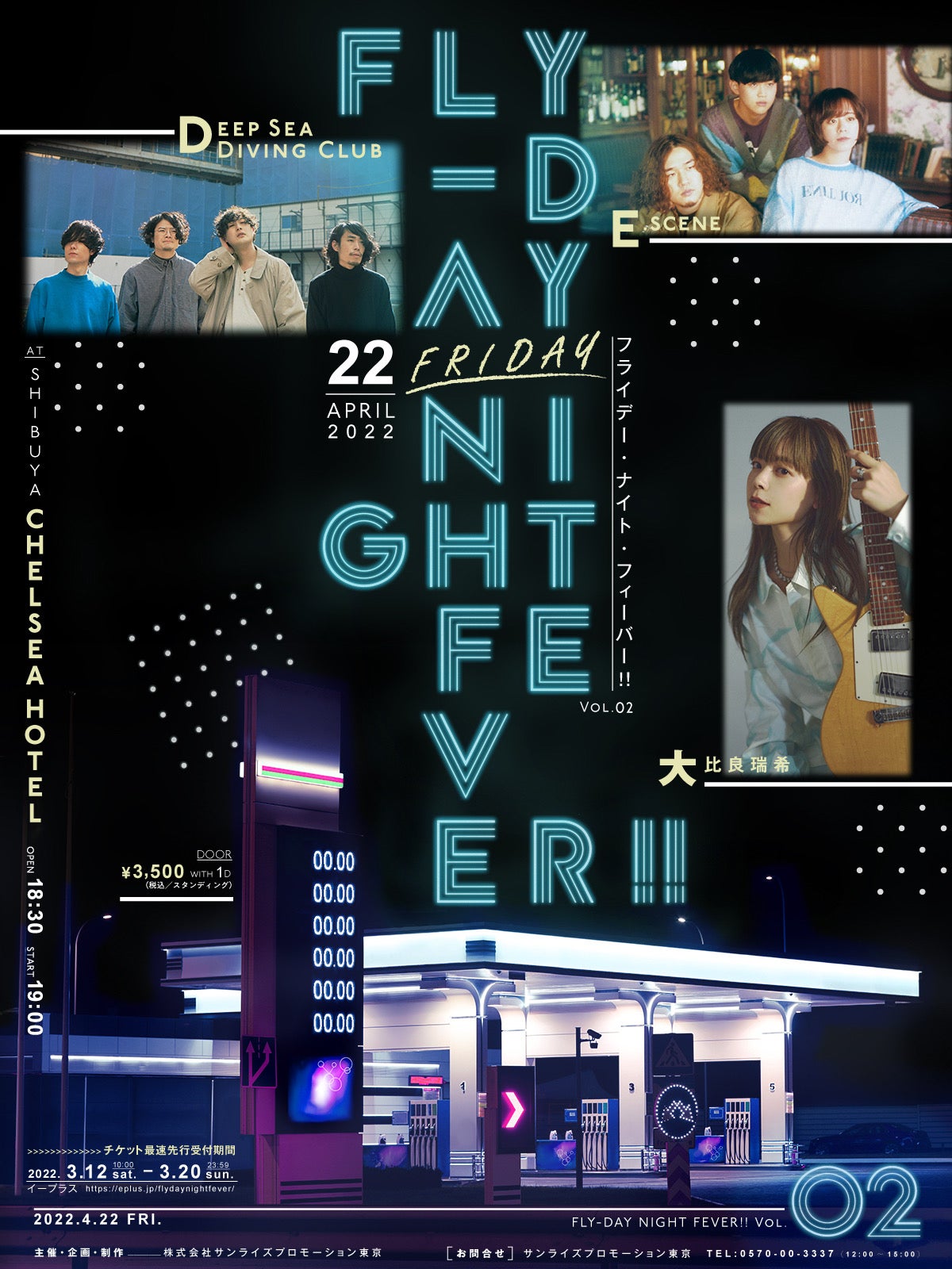 2022年4月22日(金)に東京・渋谷チェルシーホテルで開催する音楽イベント「FLY-DAY NIGHT FEVER vol.2」に、E.scene、大比良瑞樹、Deep Sea Diving Clubの出演が決定。チケットは3月12日(土)10:00より、イープラスにて最速先行販売を開始します。