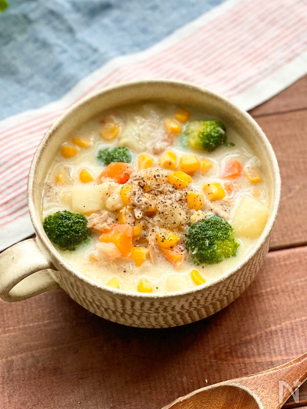 これ一杯で1日に必要な野菜の半分以上が摂れる、栄養満点スープです。具材がゴロゴロ入っているので、満足感もばっちり。野菜とツナのうま味が豆乳スープにじんわり溶け込み、心も体も温まります。バケットを添えて食べるのもおすすめです。