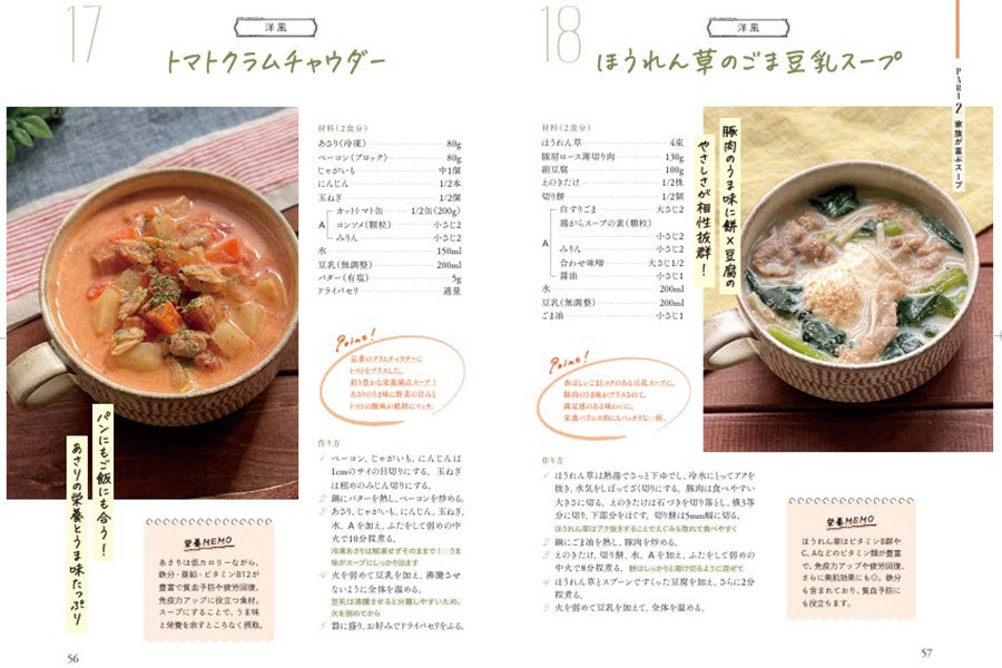 本書には、シンプルな工程で作りやすく、栄養満点な「具だくさんスープ」のレシピを多数掲載。このプレスリリースでは「人気のスープベスト10」の中から、おすすめのスープを3品ピックアップしてご紹介します。