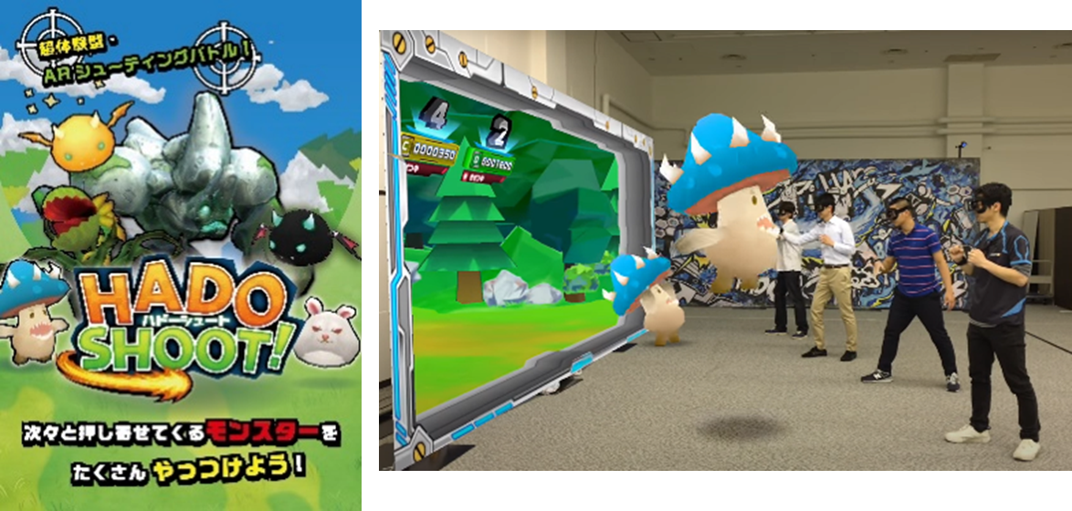 「HADO SHOOT!」は最大4人でプレーできるARシューティングゲームです。ゲームがスタートすると、壁の向こう側にバーチャル空間が出現します。目の前に突如として現れるモンスターをキミの手で撃退しよう!他のプレーヤーと協力してプレーすることが可能です。