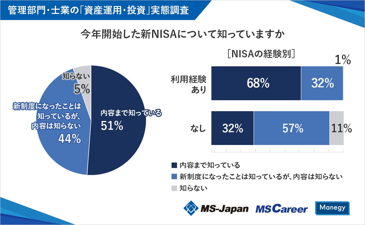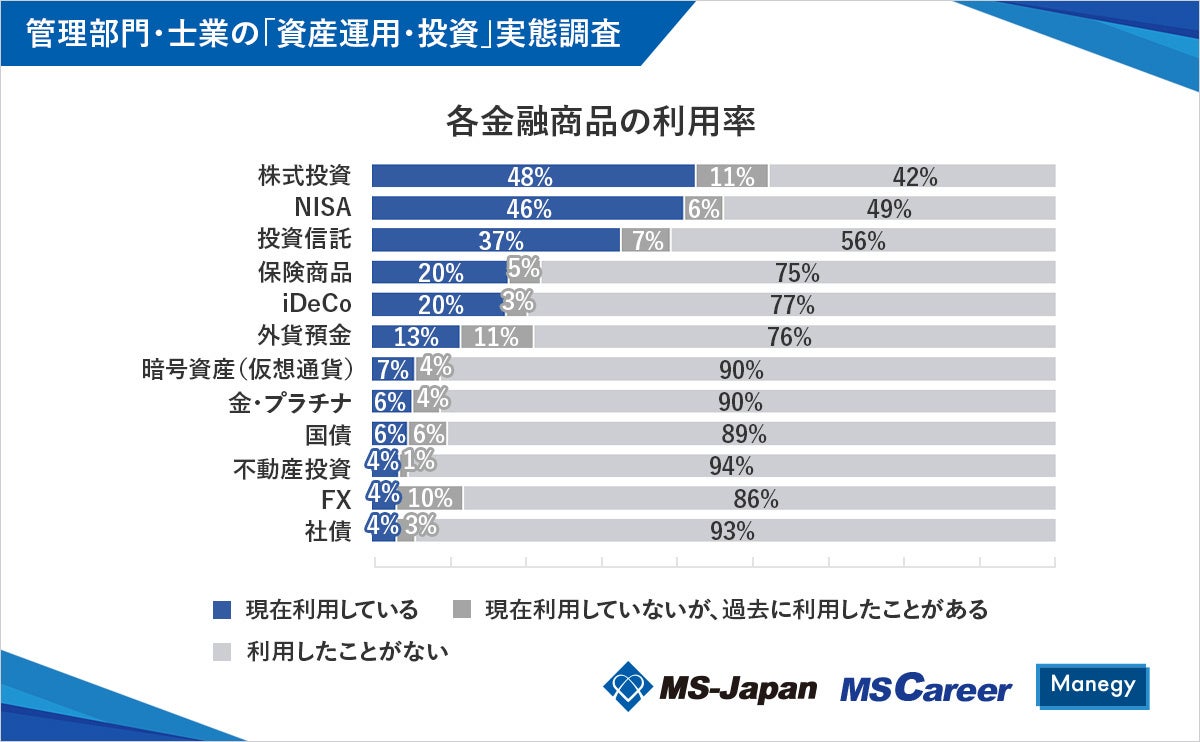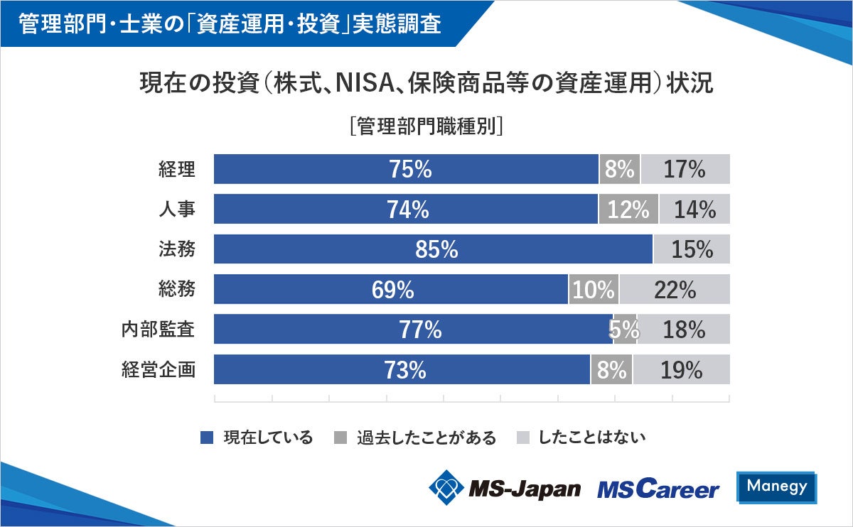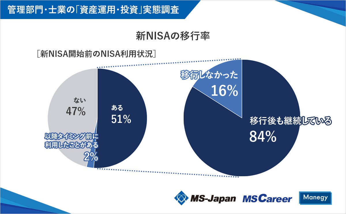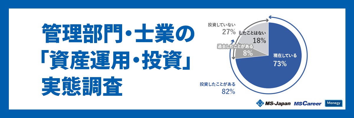 株式会社MS-Japan(本社:東京都千代田区 代表取締役会長兼社長CEO:有本隆浩/以下MS-Japan 証券コード:6539)が運営する、管理部門・士業の総合転職サービス「MS Career(エムエスキャリア)」は、2月13日の「NISA(ニーサ)の日」にあわせ、『管理部門・士業の「資産運用・投資」実態調査』を発表しましたので、お知らせいたします。本調査は、管理部門・士業のためのビジネスメディア「Manegy(マネジー)」にて管理部門・士業人材301人に実施いたしました。