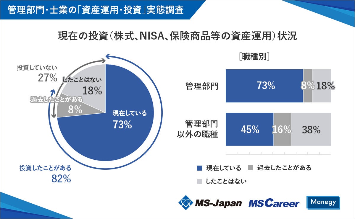 また職種によっても違いがみられ、現在投資を行っている人の割合は、管理部門が73%、管理部門以外の職種では45%と、30ポイント近くの差が明らかになりました。