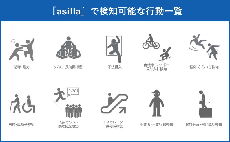 株式会社アジラ(本社:東京都町田市、代表取締役CEO:木村大介 以下「アジラ」)は、ジェイアールセントラルビル株式会社(本社:愛知県名古屋市、代表取締役社長:巣山芳樹 以下「ジェイアールセントラルビル」)が管理・運用する名古屋駅直結の複合施設「JRセントラルタワーズ」と「JRゲートタワー」に、アジラが研究を続ける行動認識AIを搭載したAI警備システム「AI Security asilla(以下、asilla)」が導入されることをお知らせいたします。
