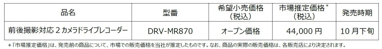 前後撮影対応2カメラドライブレコーダー「DRV-MR870」を発売