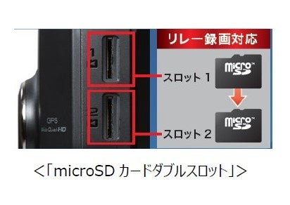 本機は、当社製「KNA-SD1280」(8月23日報道発表)をはじめ、最大容量128GBまでのSDカードを2枚同時に挿せる「microSDカードダブルスロット」を搭載しており、低フレームレート録画モードと組み合わせることで最大約100時間※1の長時間録画が可能です。また、当社市販向けドライブレコーダーでは初となる、3年間の長期製品保証を付与します。