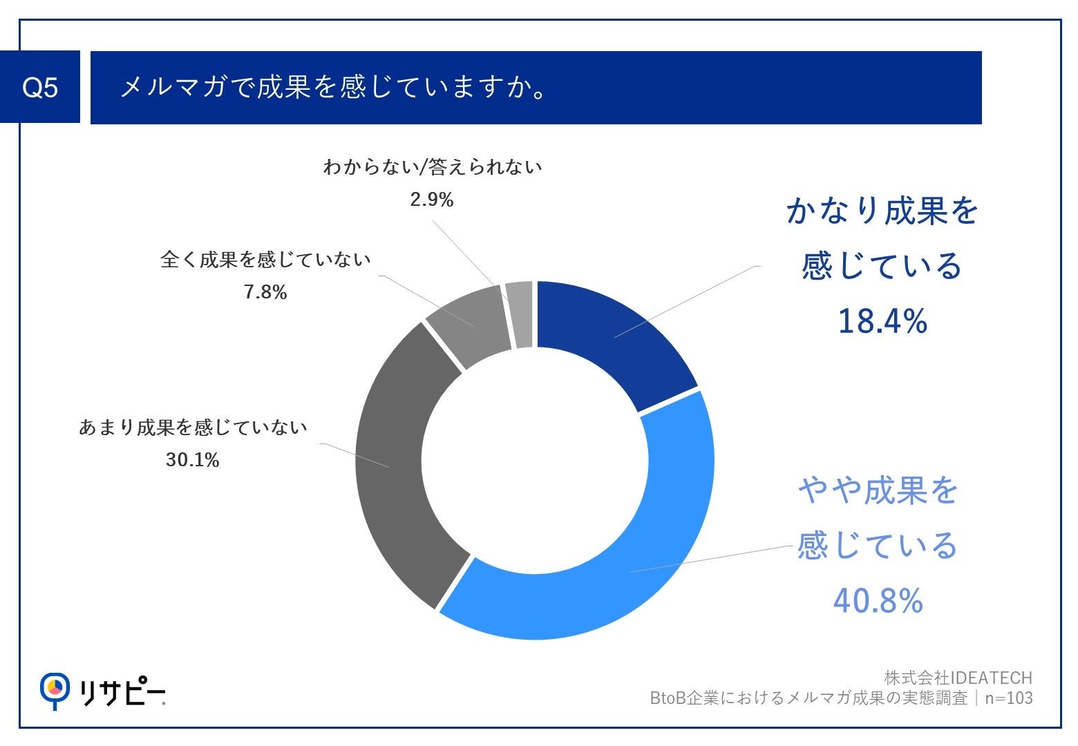 「Q5.メルマガで成果を感じていますか。」(n=103)と質問したところ、「かなり成果を感じている」が18.4%、「やや成果を感じている」が40.8%という回答となりました。