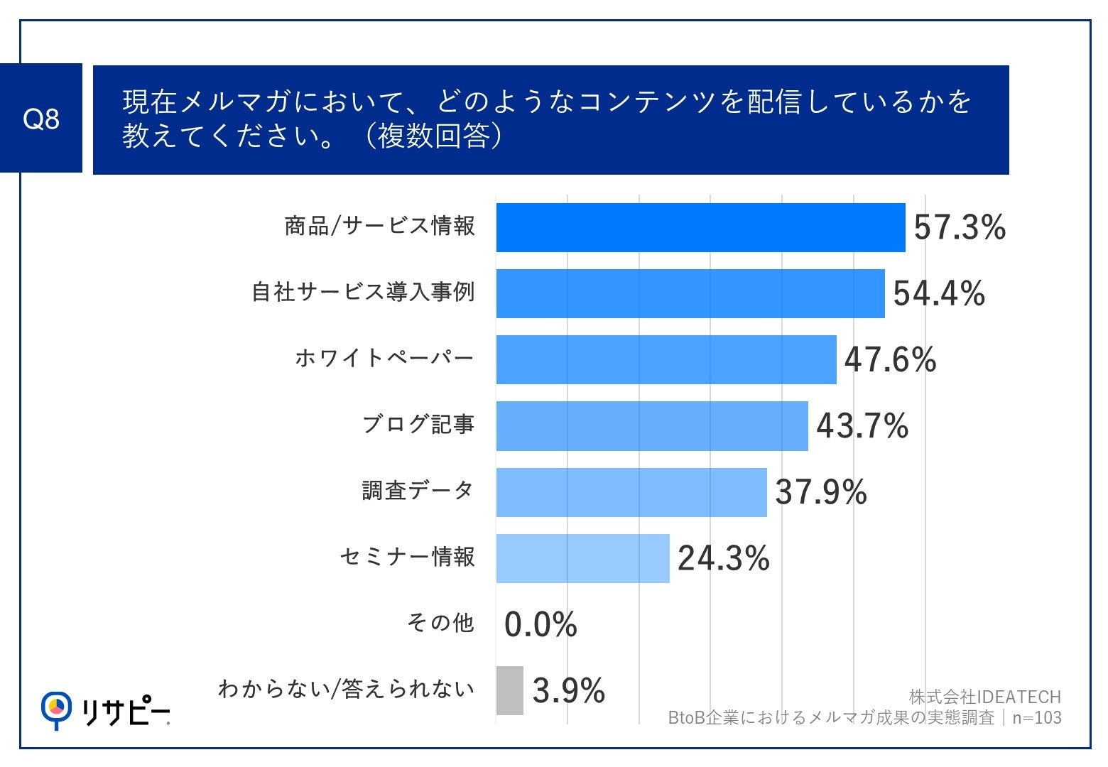 「Q8.現在メルマガにおいて、どのようなコンテンツを配信しているかを教えてください。(複数回答)」(n=103)と質問したところ、「商品/サービス情報」が57.3%、「自社サービス導入事例」が54.4%、「ホワイトペーパー」が47.6%という回答となりました。