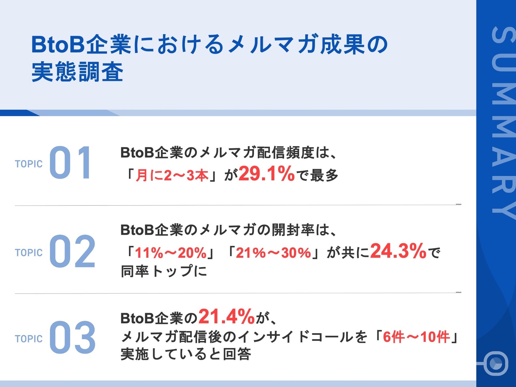 【BtoB企業におけるメルマガ成果の実態調査】配信頻度は「月に2〜3本」開封率は「11%〜30%」が最多、メルマガ配信後のインサイドコール件数は「6件〜10件」が最多の実態!