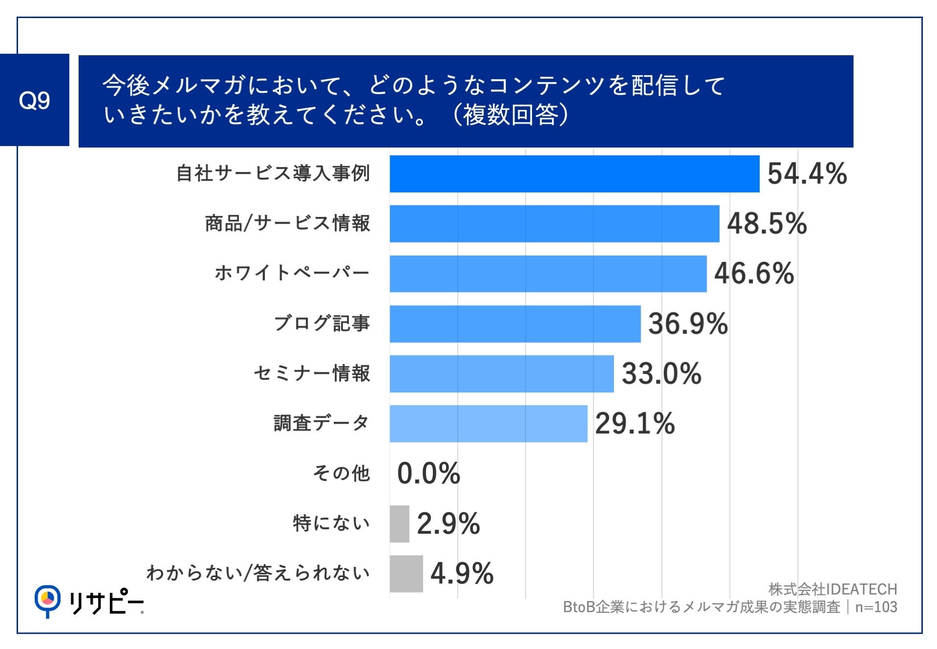 「Q9.今後メルマガにおいて、どのようなコンテンツを配信していきたいかを教えてください。(複数回答)」(n=103)と質問したところ、「自社サービス導入事例」が54.4%、「商品/サービス情報」が48.5%、「ホワイトペーパー」が46.6%という回答となりました。