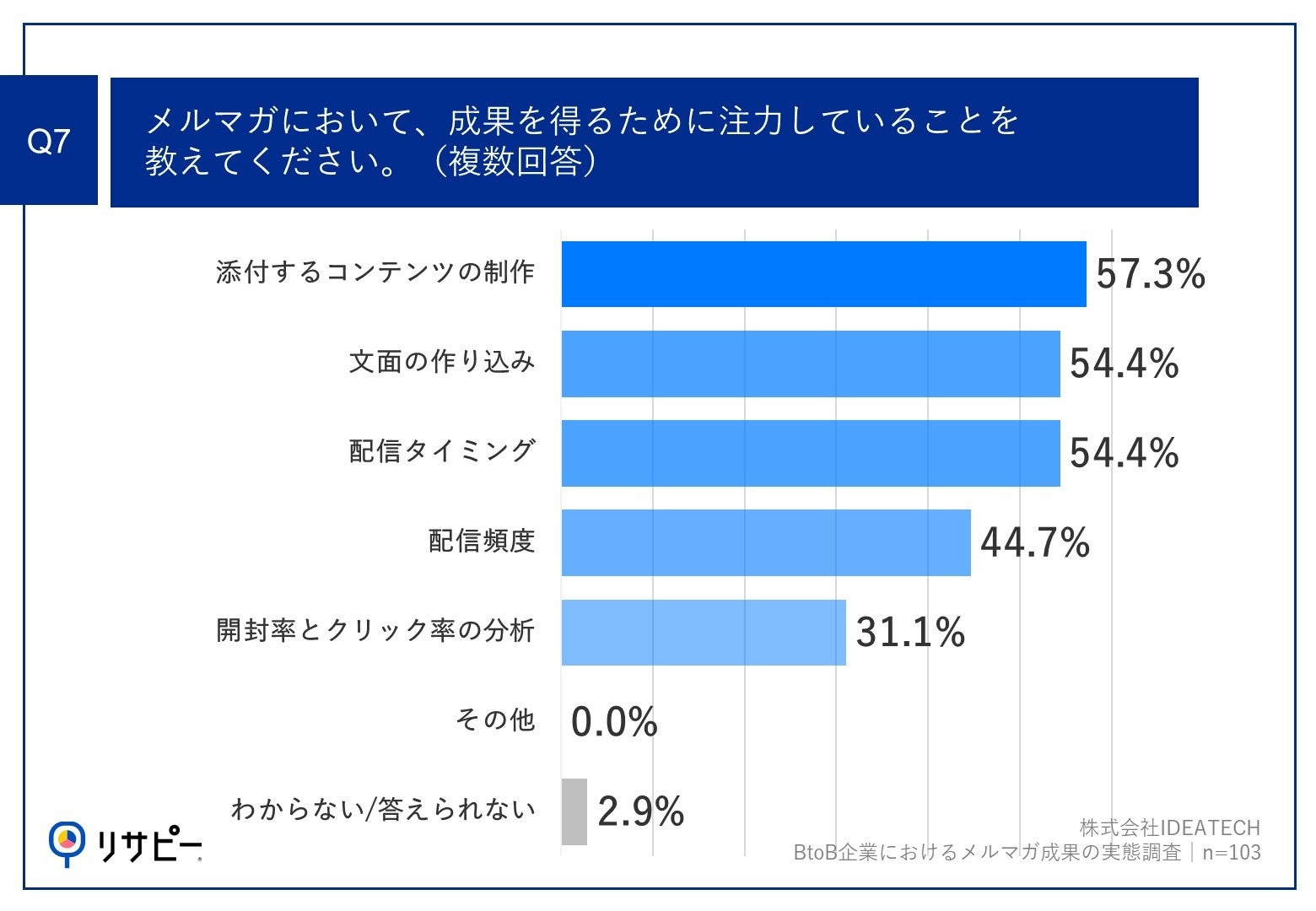 「Q7.メルマガにおいて、成果を得るために注力していることを教えてください。(複数回答)」(n=103)と質問したところ、「添付するコンテンツの制作」が57.3%、「文面の作り込み」が54.4%、「配信タイミング」が54.4%という回答となりました。