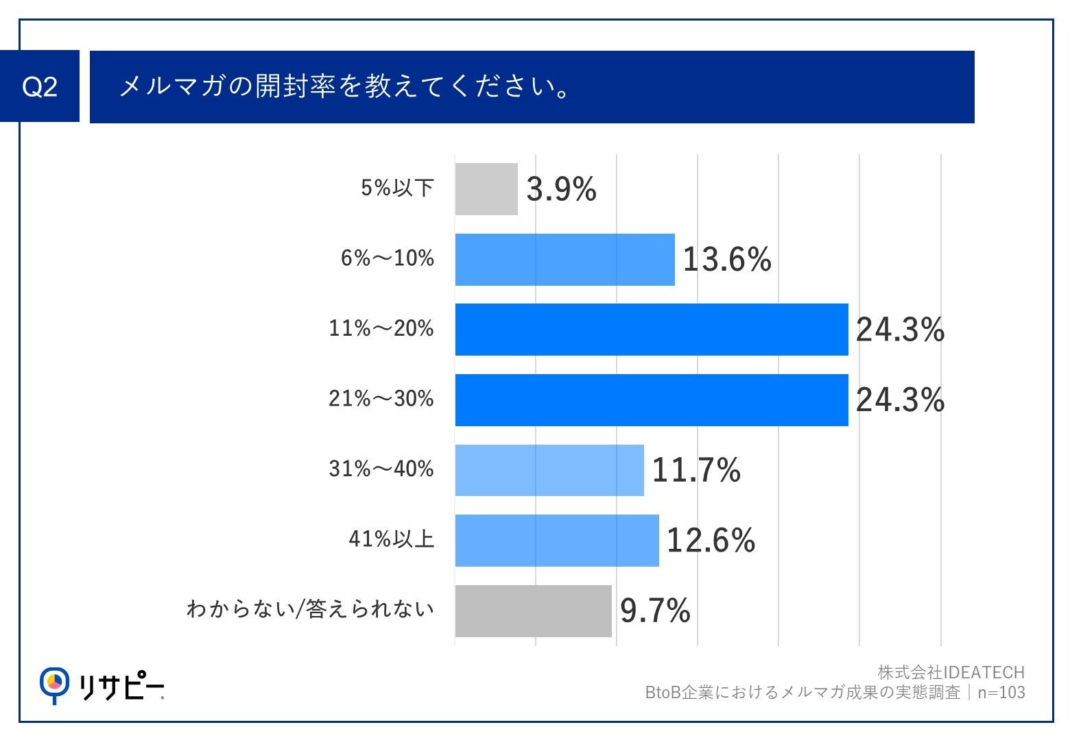 「Q2.メルマガの開封率を教えてください。」(n=103)と質問したところ、「11%~20%」が24.3%、「21%~30%」が24.3%、「6%~10%」が13.6%という回答となりました。