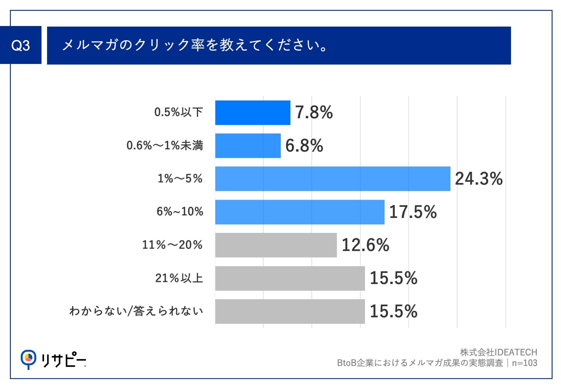 「Q3.メルマガのクリック率を教えてください。」(n=103)と質問したところ、「1%~5%」が24.3%、「6%~10%」が17.5%、「21%以上」が15.5%という回答となりました。