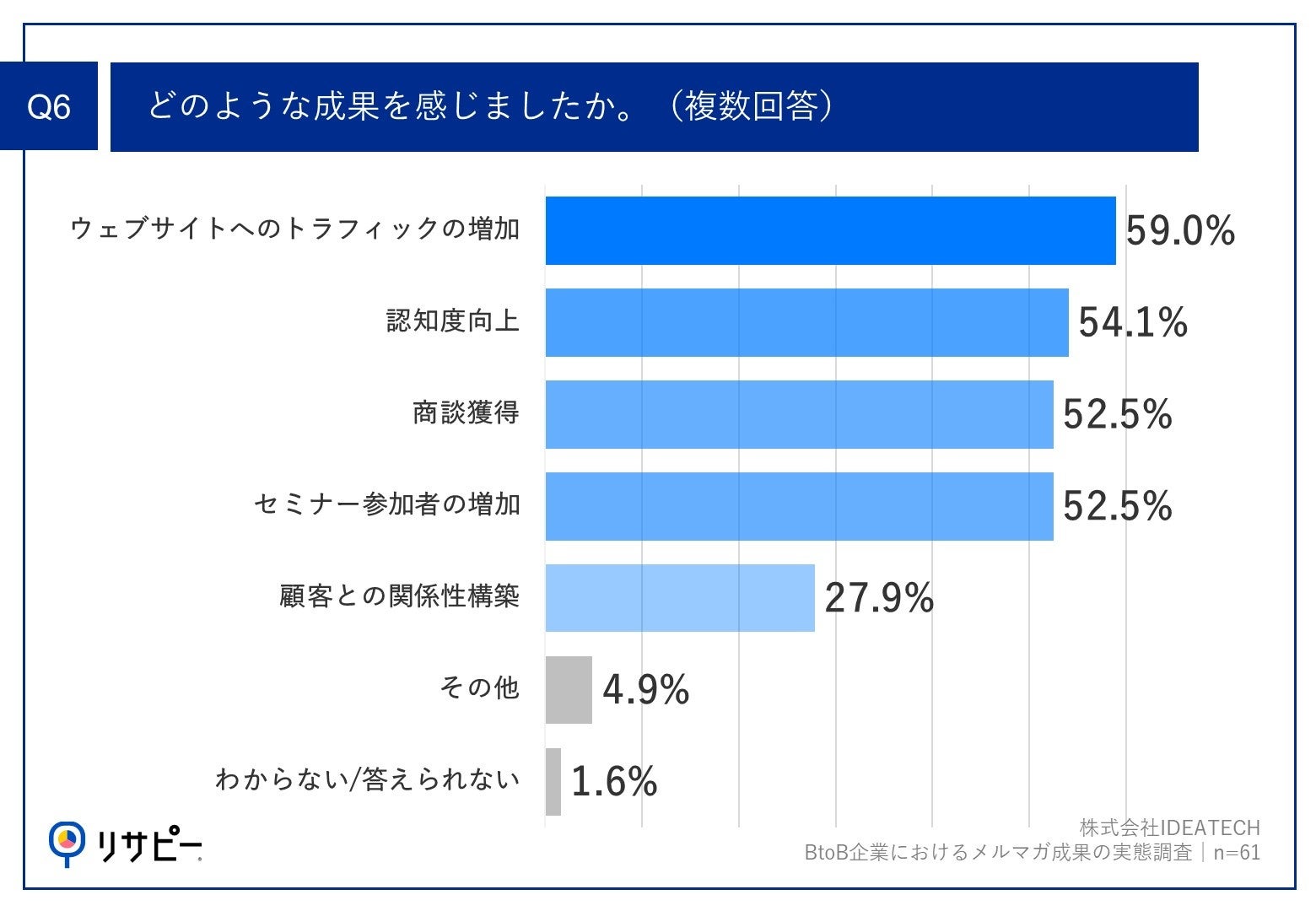 Q5で「かなり成果を感じている」「やや成果を感じている」と回答した方に、「Q6.どのような成果を感じましたか。(複数回答)」(n=61)と質問したところ、「ウェブサイトへのトラフィックの増加」が59.0%、「認知度向上」が54.1%、「商談獲得」が52.5%、「セミナー参加者の増加」が52.5%という回答となりました。