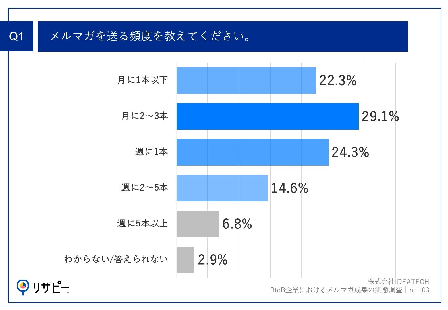 「Q1.メルマガを送る頻度を教えてください。」(n=103)と質問したところ、「月に2~3本」が29.1%、「週に1本」が24.3%、「月に1本以下」が22.3%という回答となりました。