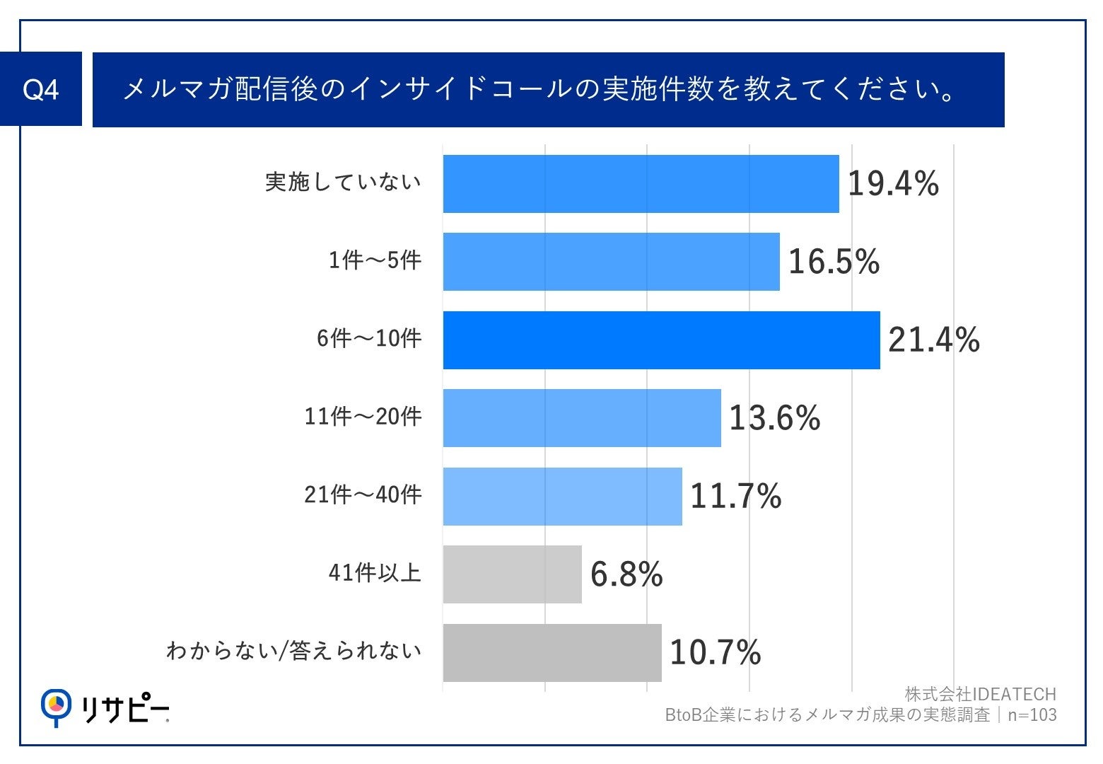 「Q4.メルマガ配信後のインサイドコールの実施件数を教えてください。」(n=103)と質問したところ、「6件~10件」が21.4%、「実施していない」が19.4%、「1件~5件」が16.5%という回答となりました。