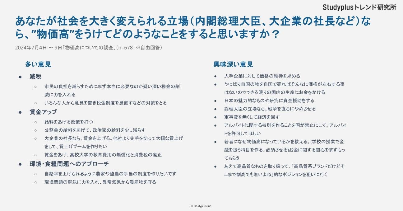 記事内で最後に紹介した設問『あなたが社会を大きく変えられる立場(内閣総理大臣、大企業の社長など)なら"物価高"をうけてどのようなことをすると思いますか?』の自由回答では、教育や政策など、さまざまな視点でのユニークなアイデアが集まりました。