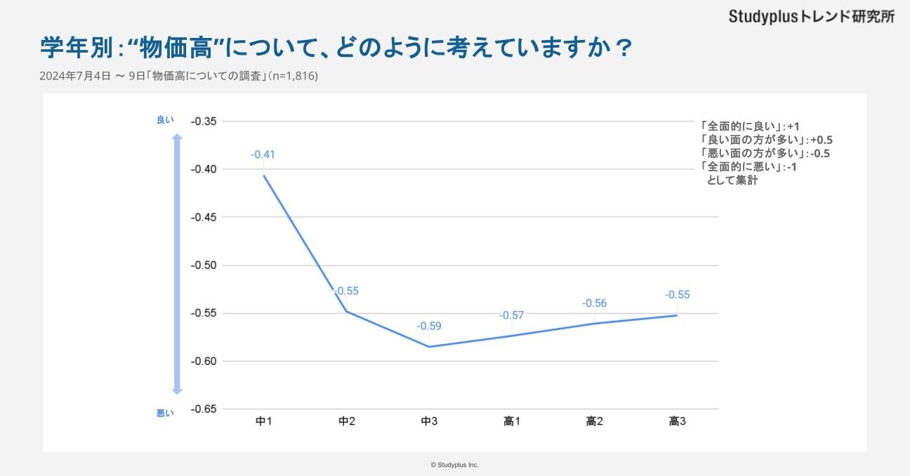 ・中学生では学年が上がるにつれて"物価高"の評価は悪くなる一方で、高校生では学年が上がるにつれて少しだけ評価が好転。