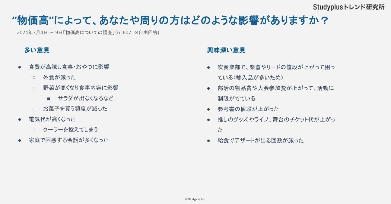 ・部活や給食といった学生生活への影響も見られており、参考書購入や趣味の「推し活」への影響といった中高生ならではの声も。