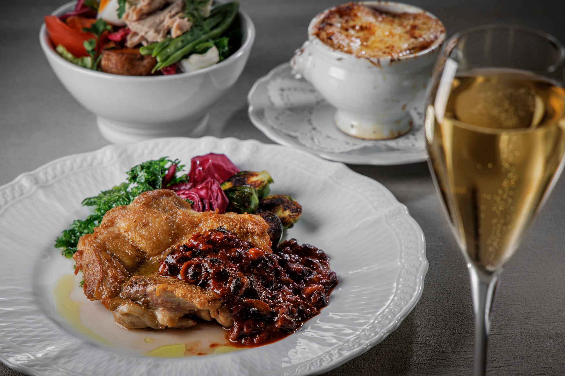 チキングリルや淡路島産の甘い玉ねぎを使用した、名物のオニオングラタンスープが入ったコース。乾杯ドリンクも付いています。