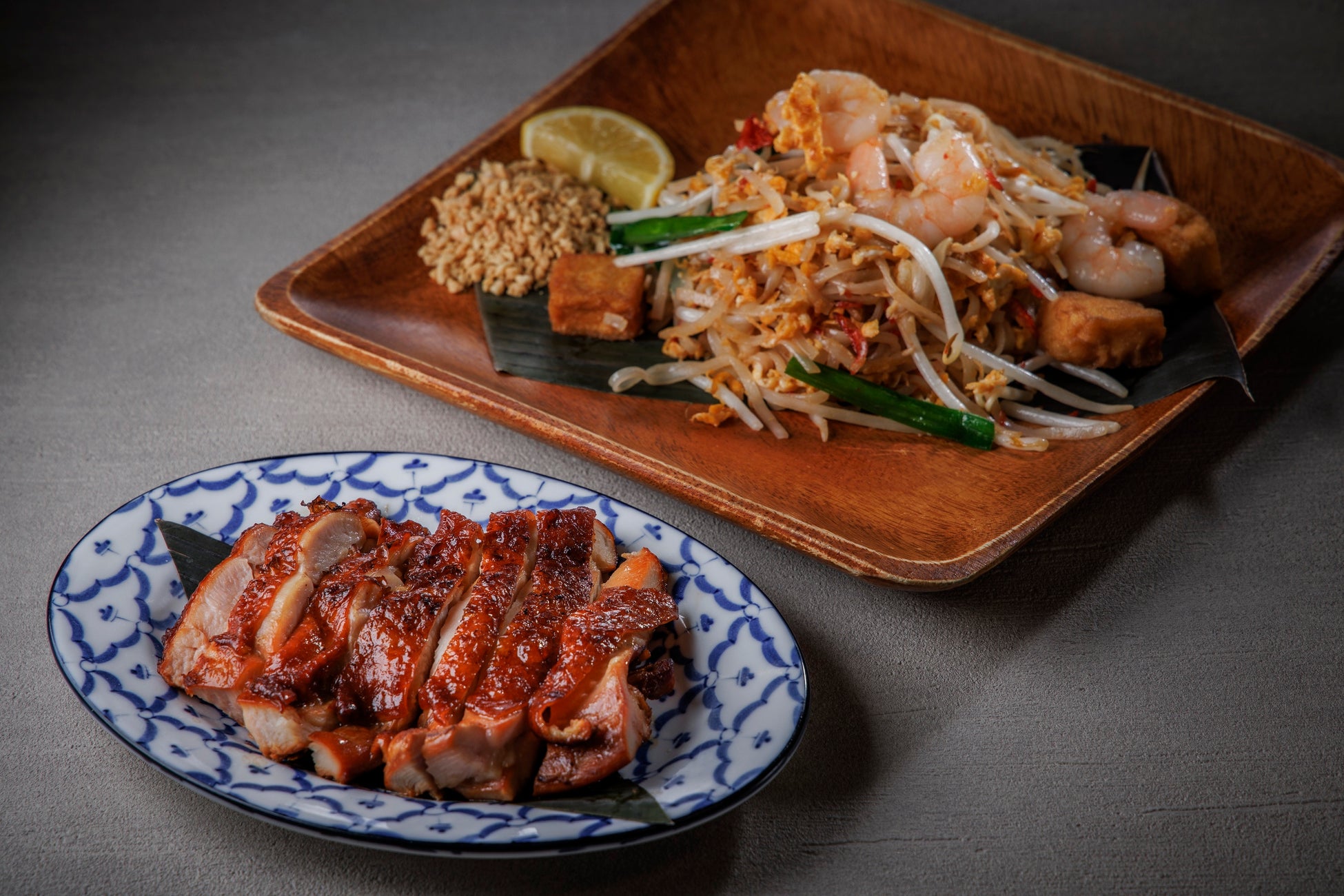 青パパイヤサラダなどの3種盛り合わせ、自家製ソースで漬け込み焼き上げた鶏の炙り焼き、タマリンドソースを使ったタイ式焼きそばなどのコース。