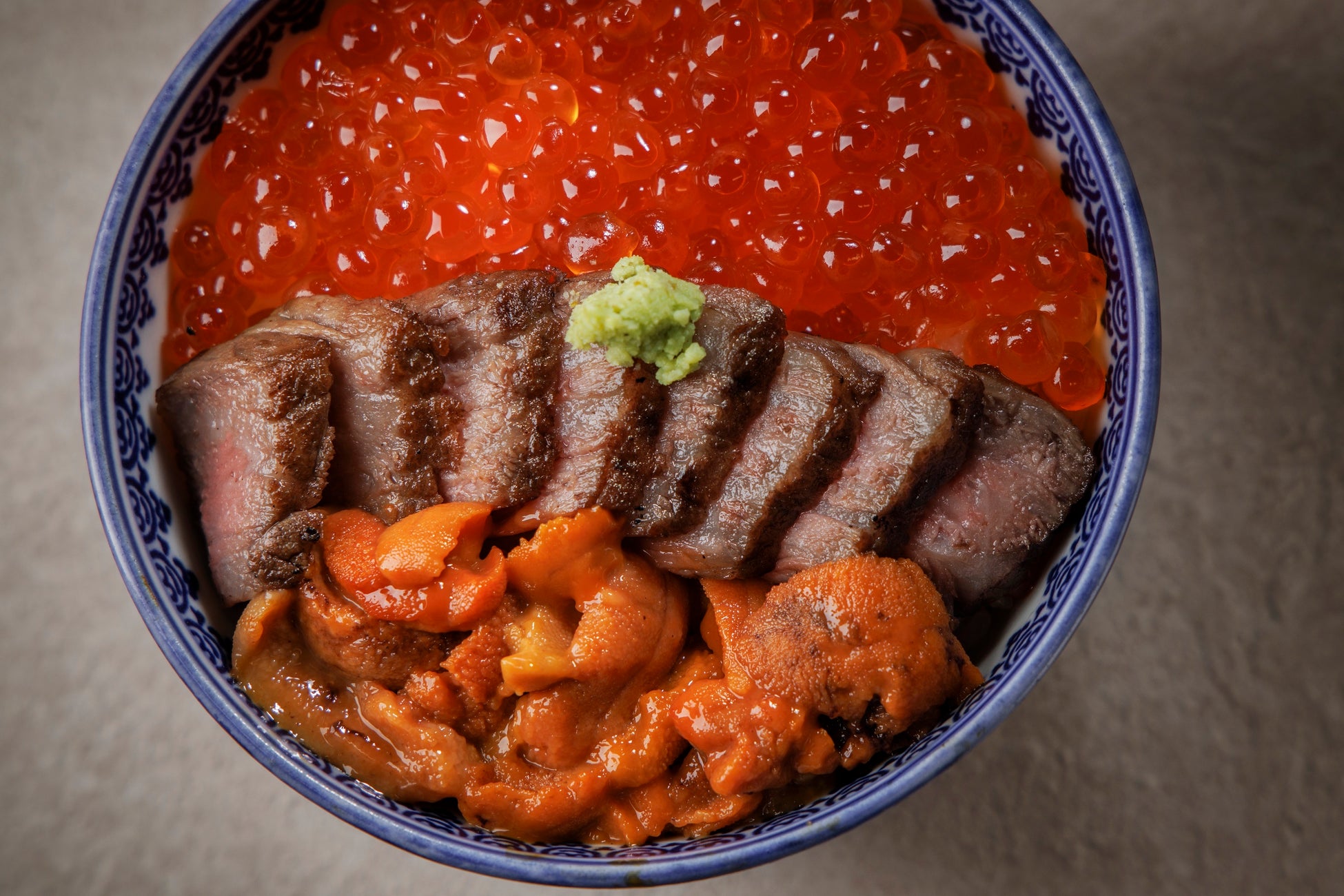 仙台牛のイチボと北海道のウニ、いくらという豪華食材をちょうどいい小丼で楽しめます。低温調理されたイチボの食感が絶妙な一品です。