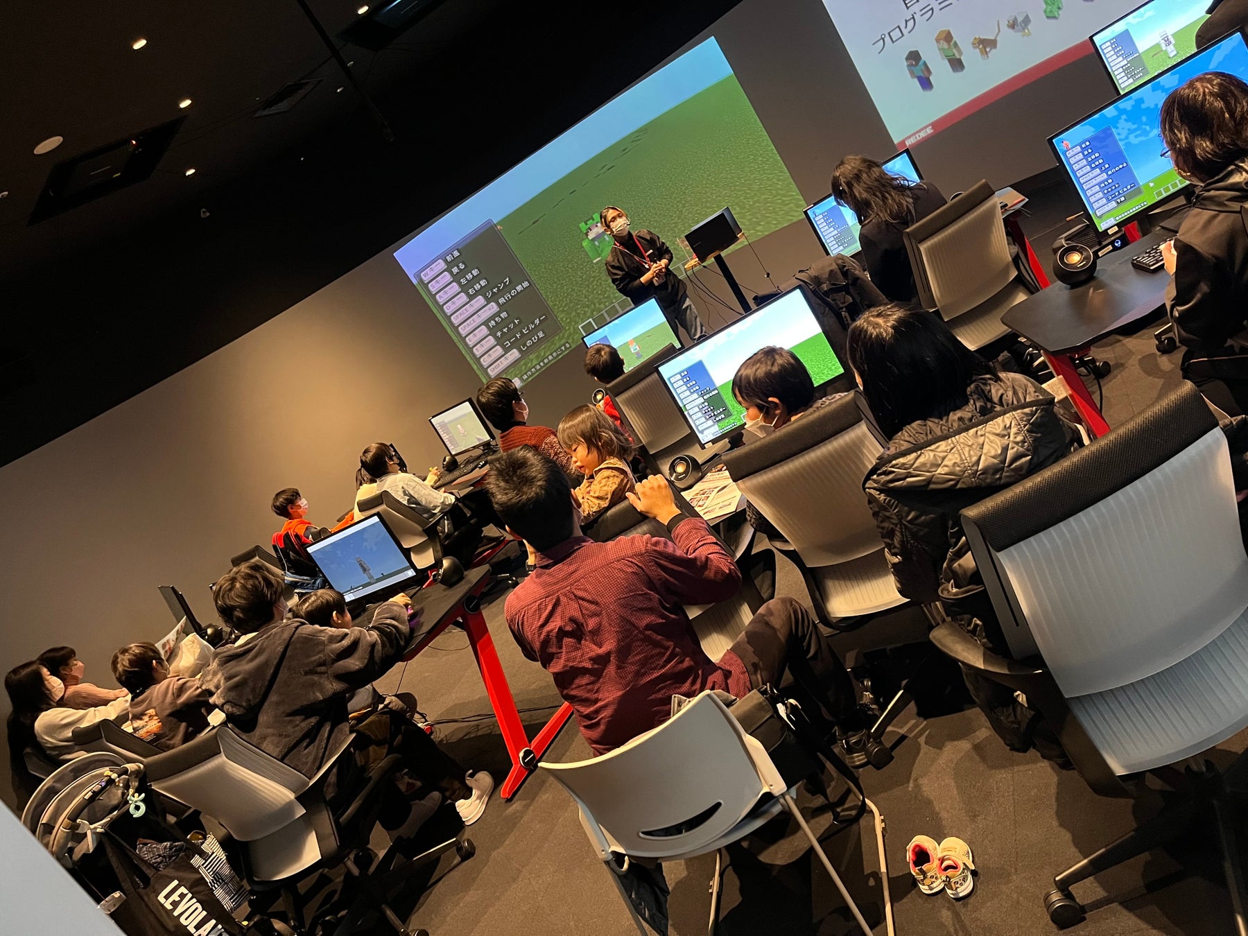 また、1階bootcampエリアではマインクラフトのプログラミング講座を開催。こちらも各回10名で4回開催。合計40名の子どもたちが大好きなマインクラフトのプログラミングを体験しました。親御さんと一緒に楽しむマインクラフトに子どもたちの笑顔が溢れました。