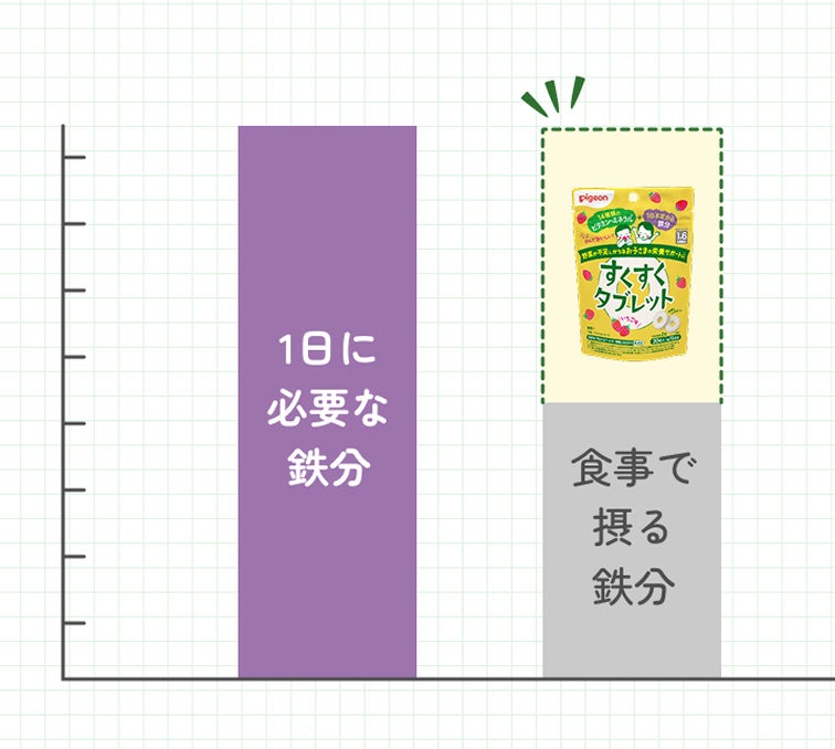 鉄は体の成長に重要な栄養素ですが、食品から摂取しにくい栄養素でもあります。実際に、1日分の鉄の推奨量4.0mgに対して摂取量は3.49mgと足りていません(※3)。