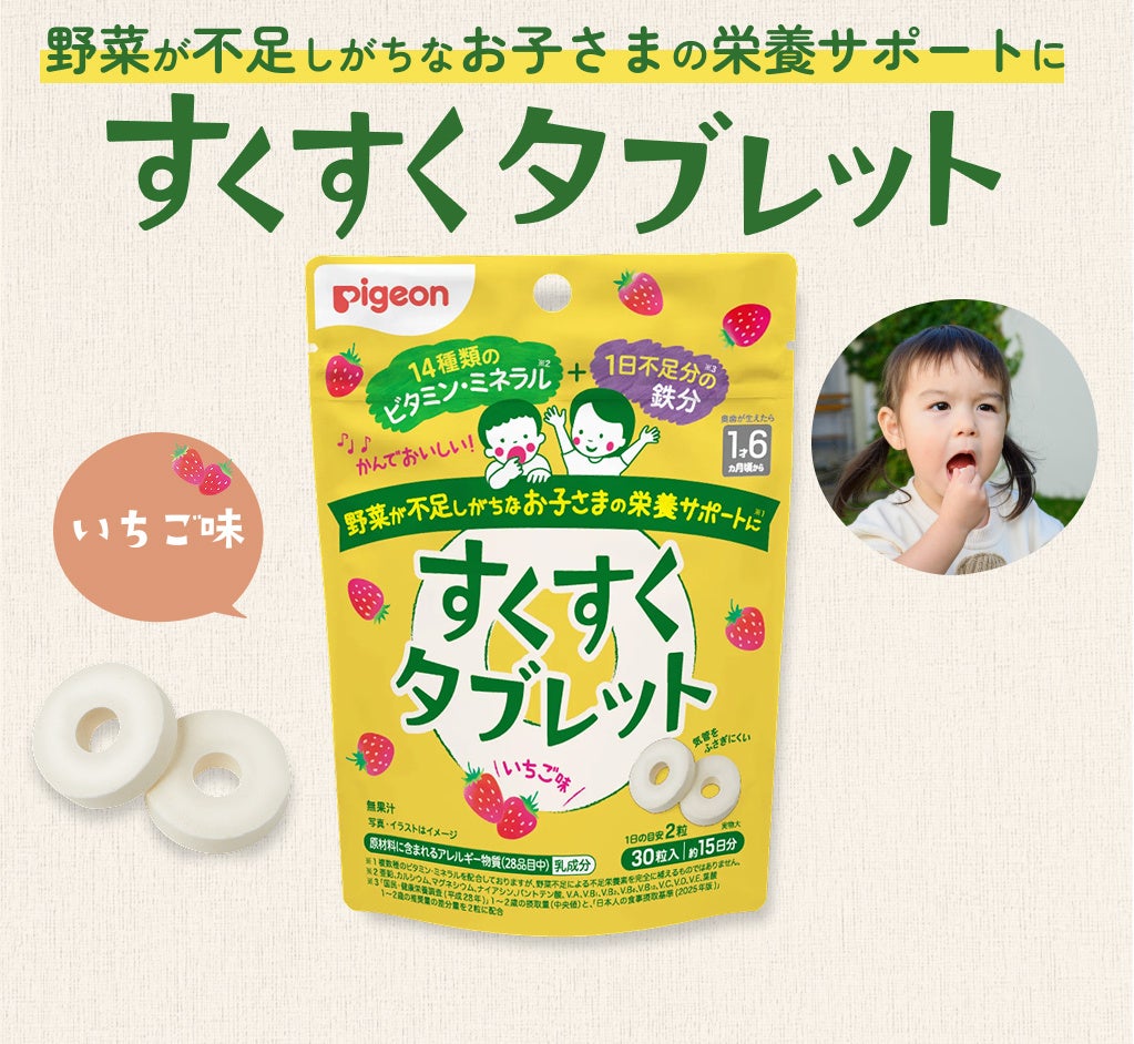 ピジョン株式会社(本社:東京、社長:矢野 亮)は、野菜が不足しがちな幼児期のお子さまに向けた「すくすくタブレット いちご味」を、2026年2月9日(月)より全国のベビー用品専門店・ドラッグストア、当社公式オンラインショップにて販売を開始いたします。