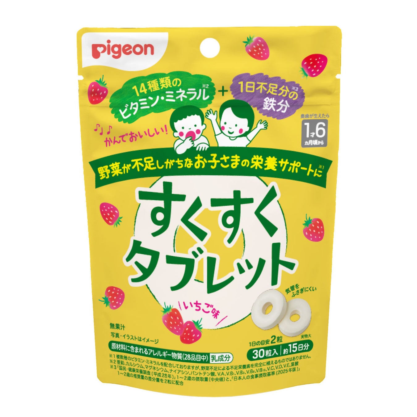 【新発売】1日たった2粒!野菜が不足しがちな幼児期のお子さまの栄養のサポートに(※1) 14種類のビタミン(※2)・ミネラル+1日不足分の鉄分(※3)を配合「すくすくタブレット いちご味」