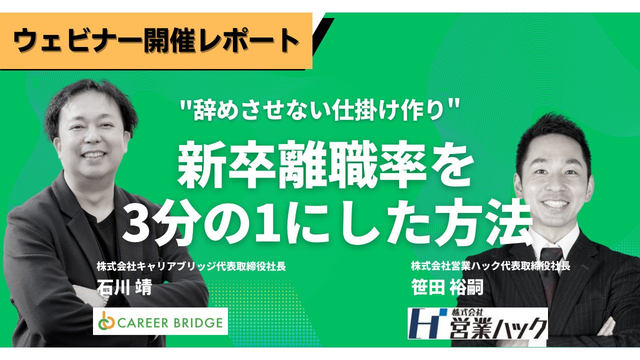 そこで今回、キャリアカウンセリングサービスを提供する株式会社キャリアブリッジの代表石川さまをお招きし、新卒離職率を3分の1にした考え方やアプローチについてお聞きする機会を設けさせていただくこととなりました。