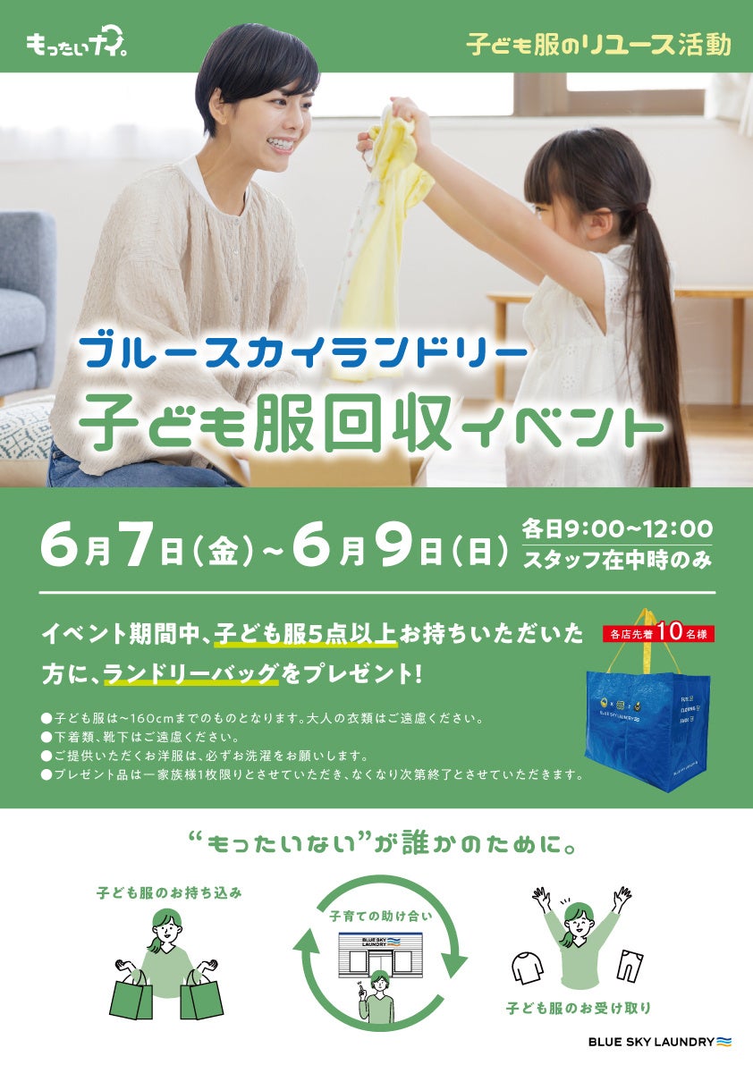 この度、2024年6月7日(金)~9日(日)の期間、子ども服リユース設置店舗の68店舗にて、子ども服回収イベントを実施いたします。イベント期間中、子ども服を5点以上お持ちいただいた方、各店先着10名様にブルースカイランドリーオリジナルランドリーバッグをプレゼントいたします。(※ランドリーバッグが数に達した場合は、お子様に喜んでいただけるブルースカイランドリーオリジナルノベルティをプレゼントいたします。数に限りがございます。)