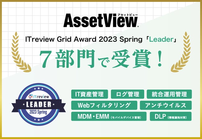 「ITreview Grid Award」とは、「ITreview」で投稿されたレビューをもとに四半期に一度ユーザーに支持された製品を表彰するものです。「AssetView」は7部門【IT資産管理/ログ管理/統合運用管理/Webフィルタリング/アンチウイルス/MDM・EMM(モバイルデバイス管理)/DLP】で「Leader」を受賞しました。