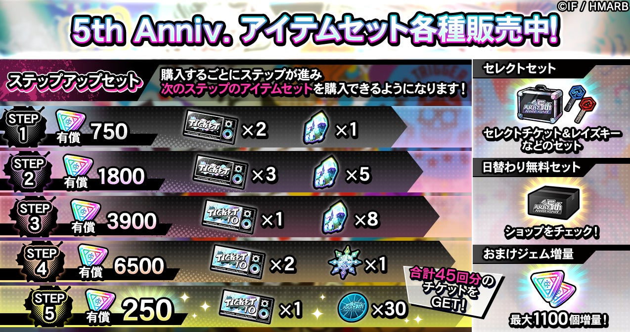 購入するごとにステップが進み、次のステップのアイテムセットが購入できる「5th Anniv. 限定スペシャルセット」など、アイテムセット5種を販売しています。また期間中、内容が日替わりで更新されるアイテムセットを無料で手に入れることが可能です。さらに、期間限定でジェムをお得に購入することができます。