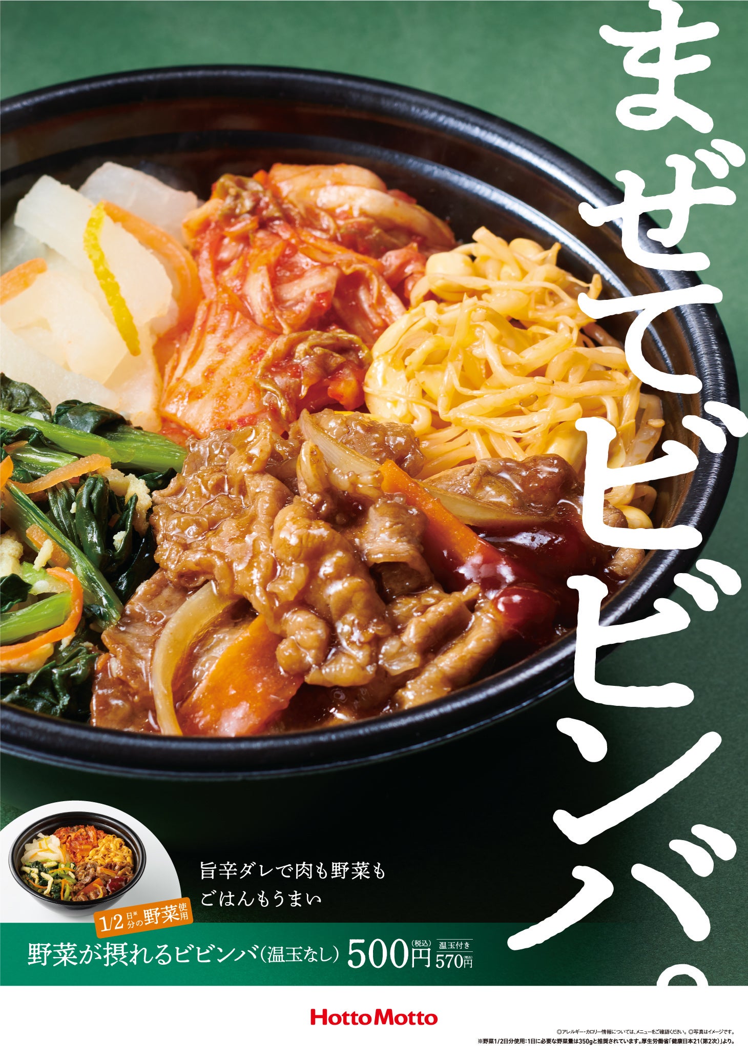 株式会社プレナスは、持ち帰り弁当の「Hotto Motto (ほっともっと)」を、2022年2月末現在、2,488店舗展開しております。このたび「ほっともっと」では、1日に必要な野菜の1/2を摂ることができる※1『野菜が摂れるビビンバ(温玉なし)』500円と、焼肉もたっぷりと楽しめる『野菜が摂れる肉増しビビンバ(温玉なし)』700円を、4月5日(火)より発売いたします。