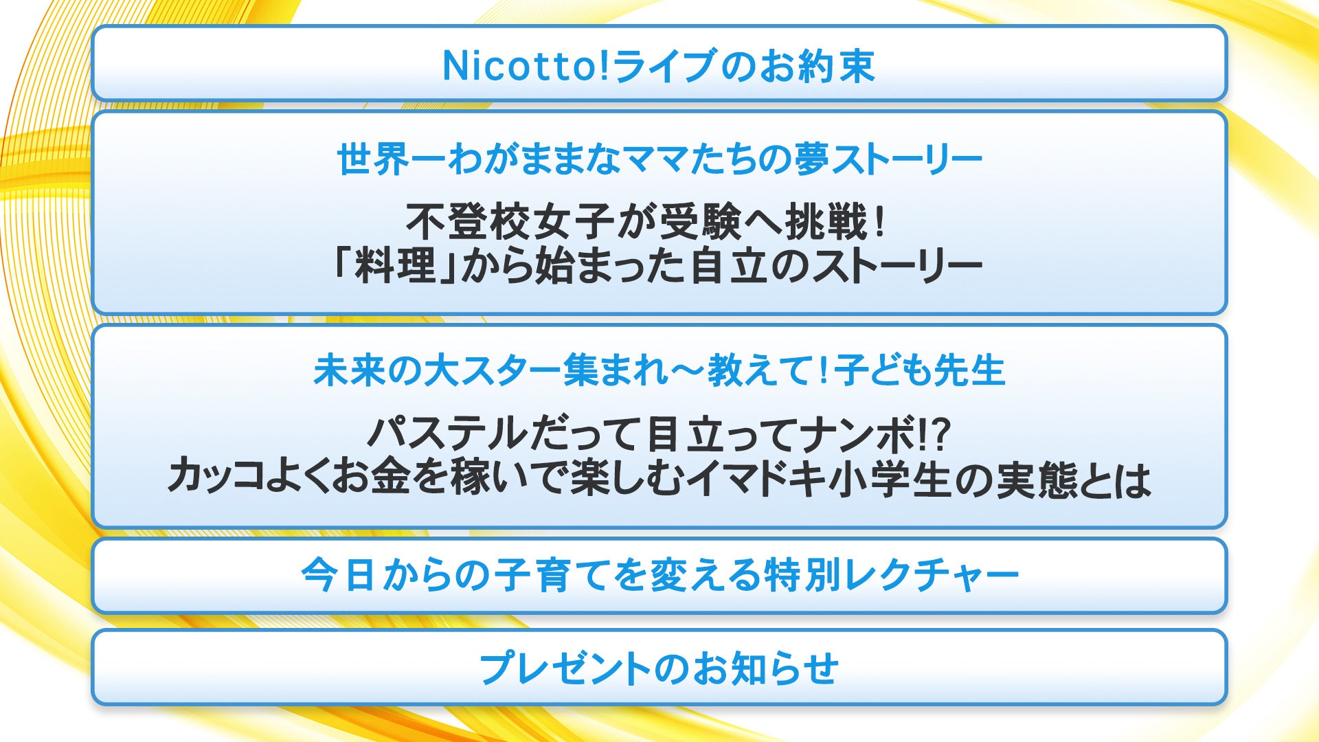 子育て優先のがんばりママが新しい自分に生まれ変わる!Nicottoライブアナウンサー。Nicotto!ライブ で 子育て優先のがんばりママが 「なりたい自分になる!」はじめの一歩を踏み出すための情報をお届けします。人生このままで終わりたくない!もっと面白く生きてみたい!そんなママを全力で応援中!