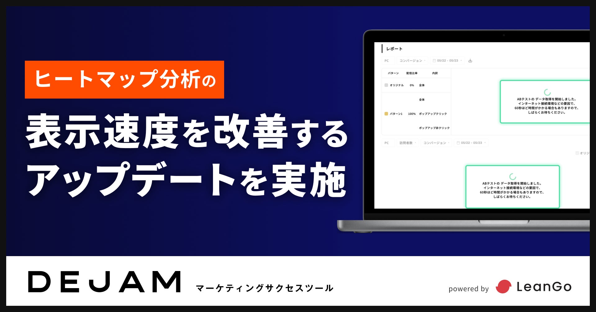 株式会社LeanGo (本社:東京都目黒区、代表取締役:平井 翔吏、以下 弊社) は、自社の運営するマーケティングサクセスツール「DEJAM( https://leango.co.jp/dejam/ )」がヒートマップ分析の表示速度を改善するアップデートを実施したことをお知らせします。