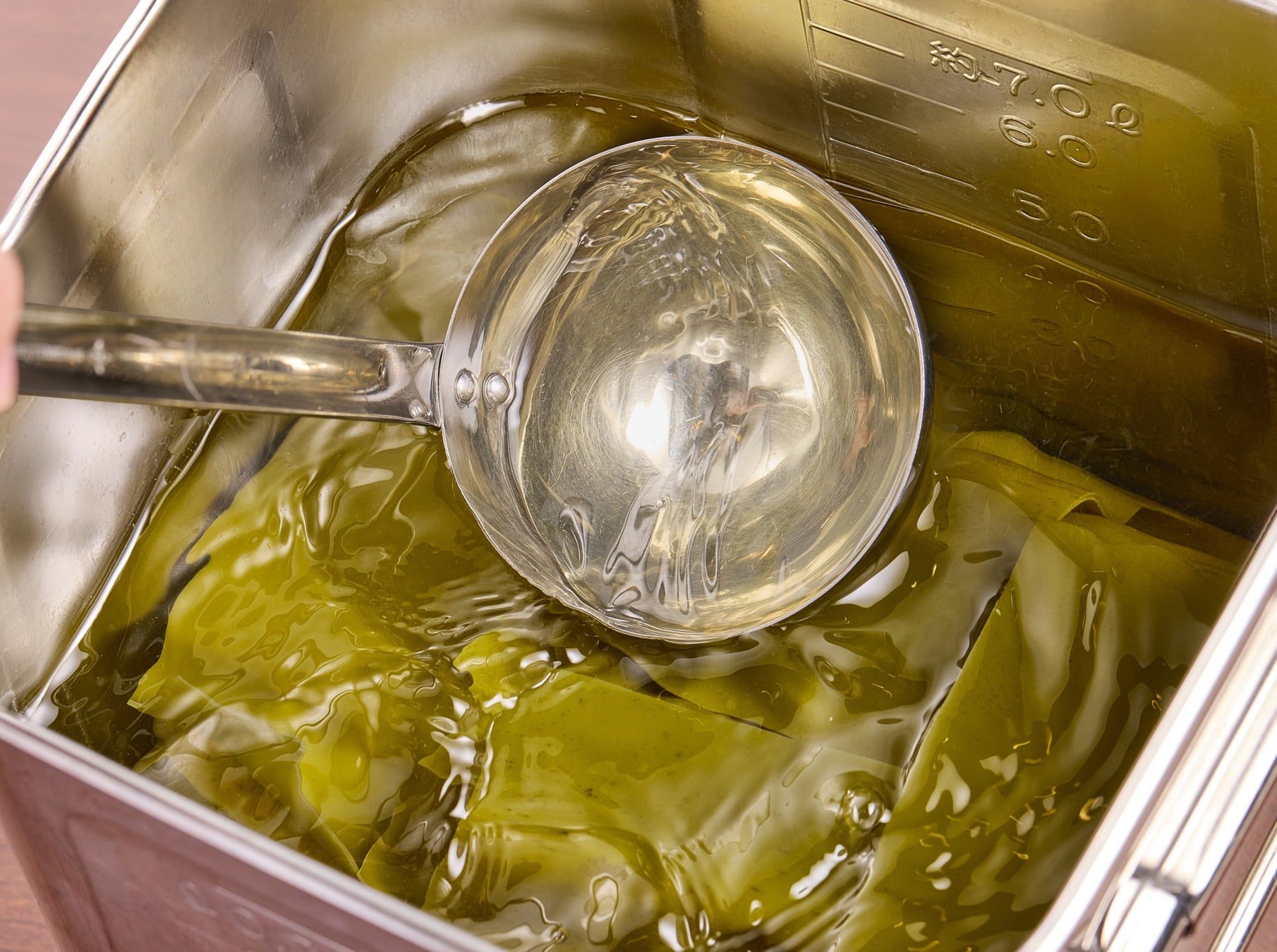 北海道産の真昆布とコクのある旨みの根昆布だし、ダブルで昆布を使用し、さらに北海道産ホタテの旨みを活かした塩だしは、コクがありつつもすっきりとした味わい。まろやかさと塩の深みが織りなすだしは夏にぴったりな仕立て。仕上げにかける黒胡椒がポイントです。