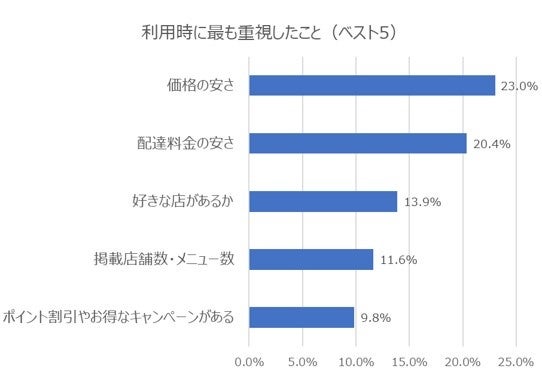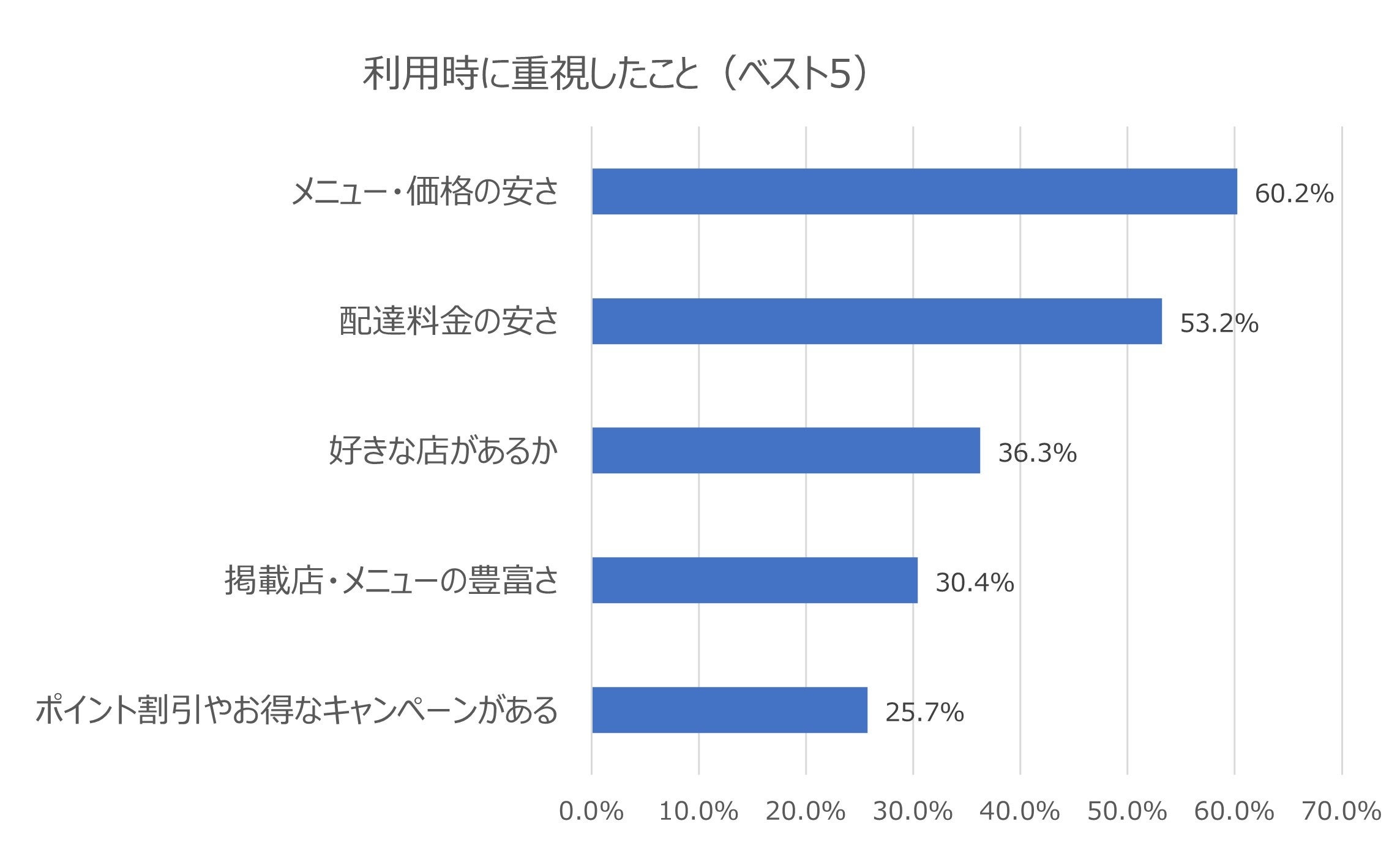 フードデリバリーの利用時に最も重視したことは、「価格の安さ」 (60.2%)が1位に。次いで「配達料金の安さ」 (53.2%) 、「好きな店があるか」 (36.3%) 、「掲載店舗数・メニュー数」 (30.4%) 、「ポイント割引やお得なキャンペーンがある」 (25.7%)という結果になりました(複数回答)。