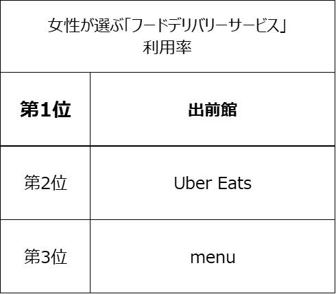 ◆女性が選ぶ「フードデリバリー」ランキング、利用率1位は「出前館」