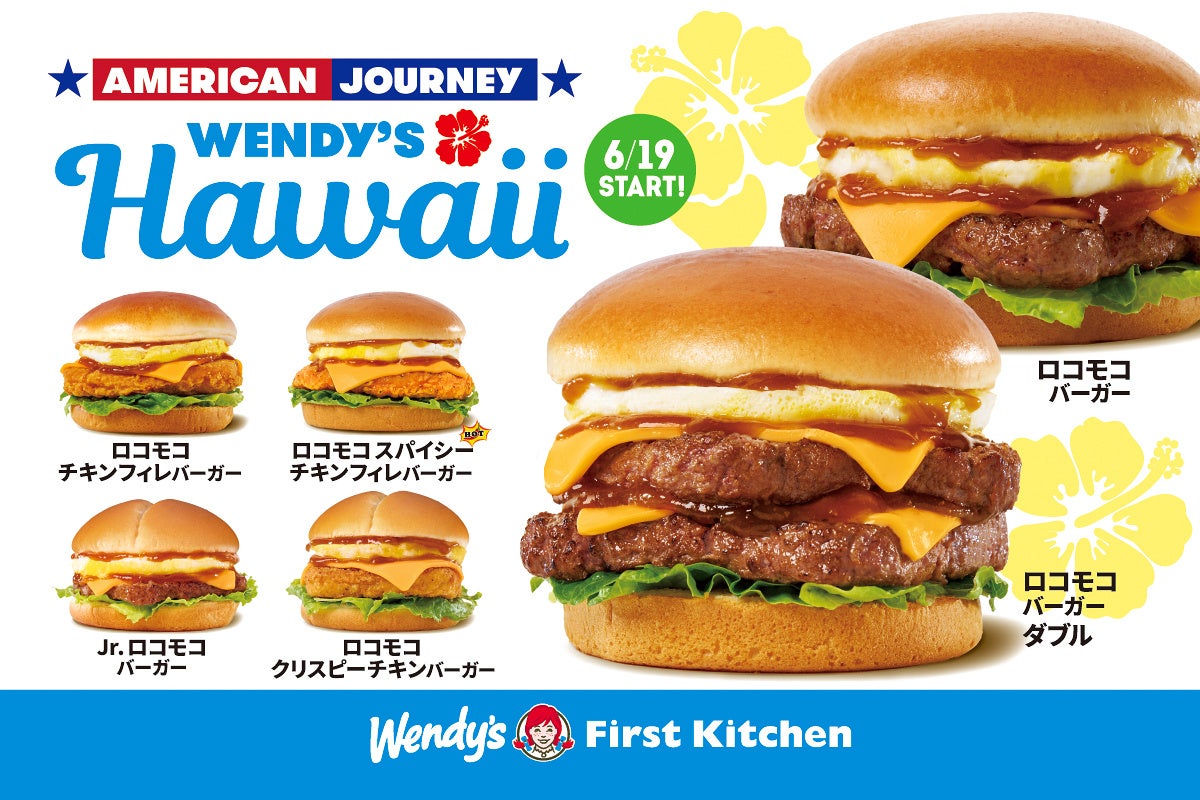 ウェンディーズ・ジャパン株式会社及び、ファーストキッチン株式会社 (所在地:東京都新宿区、代表取締役:紫関修) では、6月19日(木)からウェンディーズ・ ファーストキッチン全店にて、本格的なバーガーが楽しめる「アメリカンジャーニー※」の第2弾として「ロコモコバーガー」など、6種の新商品を発売します。ハワイの名物料理 “ロコモコ” をイメージして開発したオリジナルソースが、100%ビーフパティやチキンの旨みをより引き立てます。また、ウェンディーズ・ファーストキッチンでは味はそのままなライトメニューとして、Jr.バーガーの商品もご用意しています。ふわふわなたまごに濃厚なソースやチェダーチーズ、そしてフレッシュな野菜との調和をお楽しみください。