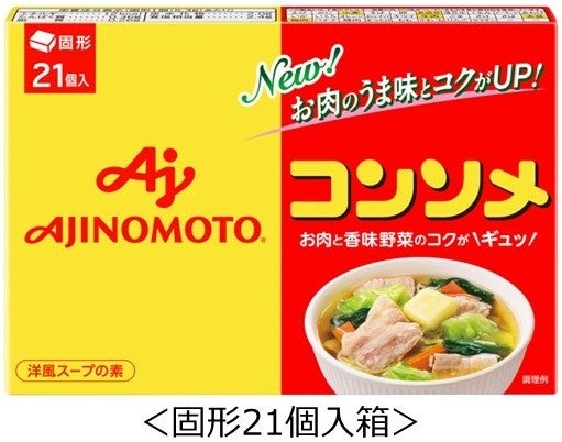 肉の風味とコクが強く感じられ、洋風のスープをはじめとするさまざまなメニューをこれまで以上においしく楽しめる味わいにリニューアルしました。またパッケージを、「味の素KKコンソメ」のおいしさの秘密として、当社の製法や原料へのこだわりを伝達するデザインに変更しました。