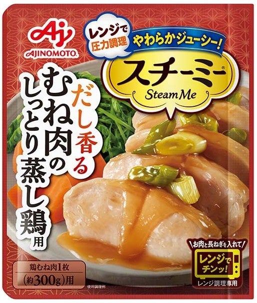 「スチーミー®」初の"鶏むね肉”用品種です。独自の配合と圧力スチームパウチにより、レンジ調理でも鶏むね肉がしっとりおいしく仕上がります。ソースは鰹と昆布のだしを合わせた和風の味付けで、夕食の主菜にピッタリです。