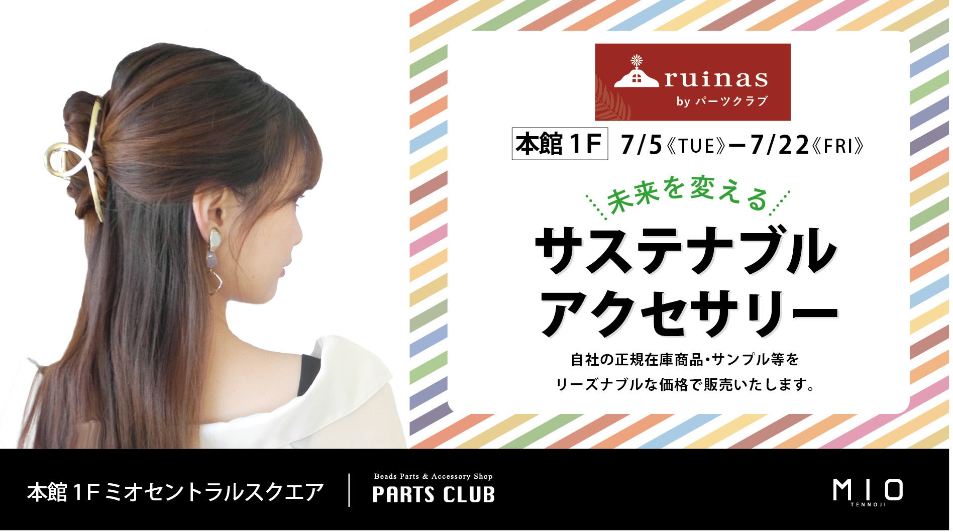 PARTS CLUBのサステナブルアクセサリーショップ「ruinas by PARTS CLUB」。7/5(火)~7/22(金)天王寺MIO本館1Fにて期間限定オープン!