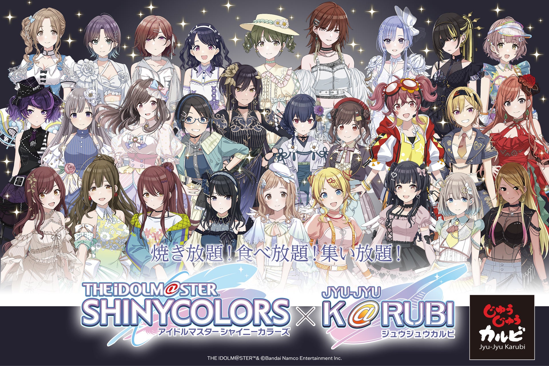 株式会社トマトアンドアソシエイツ(本社:兵庫県西宮市、代表取締役社長:笹村 啓介)が運営する、焼肉食べ放題「じゅうじゅうカルビ」では、2026年2月26日(木)より「アイドルマスター シャイニーカラーズ」とのコラボキャンペーンを開催いたします。対象のコースをご注文のお客様に、数量限定のオリジナルカードをランダムでプレゼントいたします。また、3月にはじゅうじゅうカルビ公式Xにてフォロー&リポストキャンペーンを開催いたします。