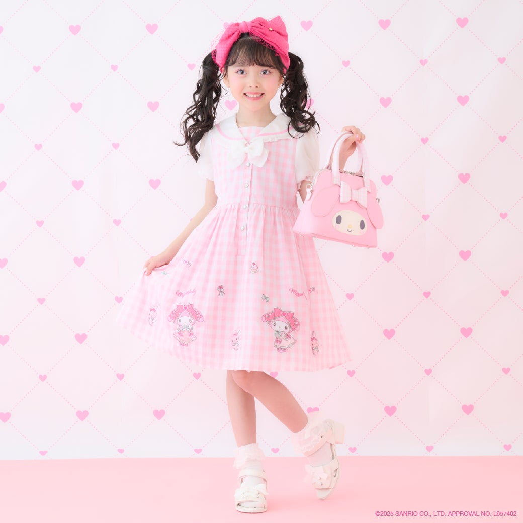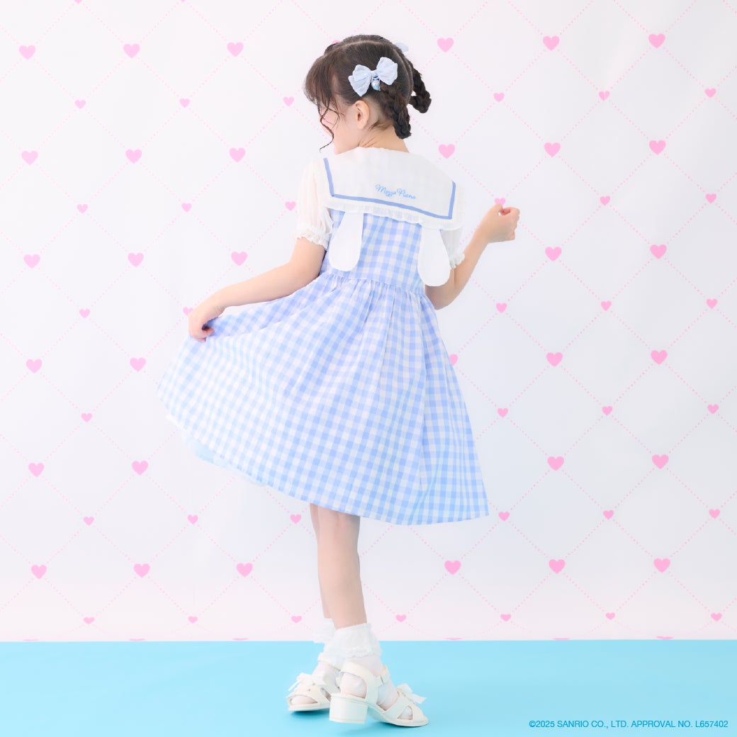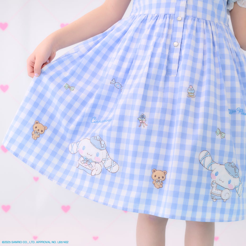 セーラーカラーのブラウスをレイヤードしている様なデザインのギンガムワンピースは、スカート部分に、「マイメロディ」「シナモロール」のそれぞれ豪華なアップリケ刺繍でかわいいを詰め込んだデザインに♡