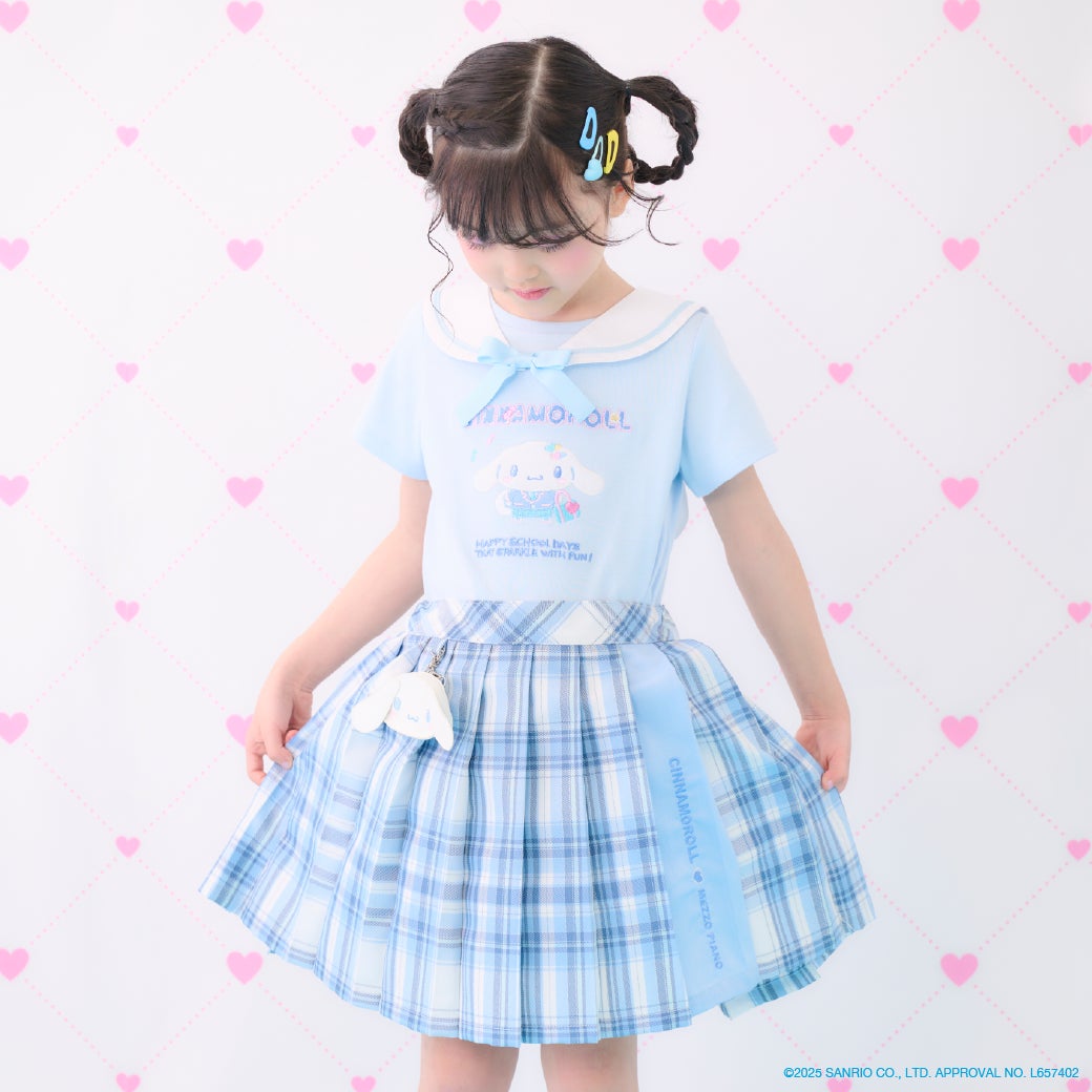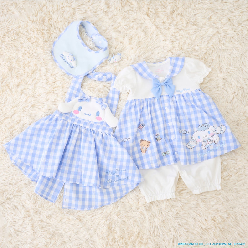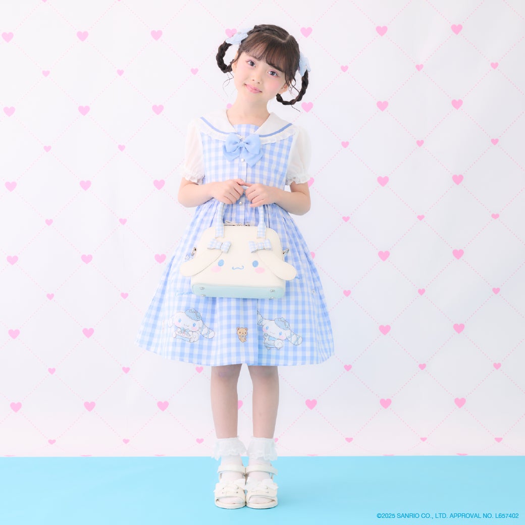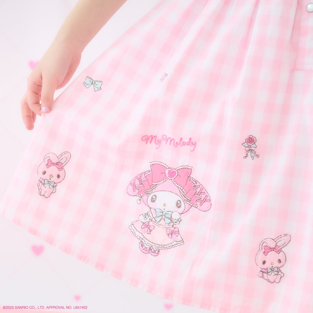 セーラーカラーのブラウスをレイヤードしている様なデザインのギンガムワンピースは、スカート部分に、「マイメロディ」「シナモロール」のそれぞれ豪華なアップリケ刺繍でかわいいを詰め込んだデザインに♡