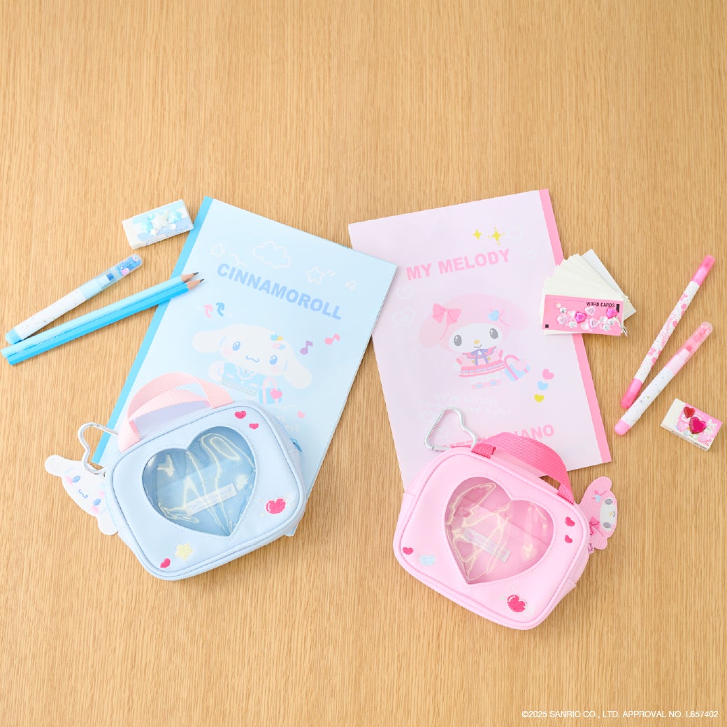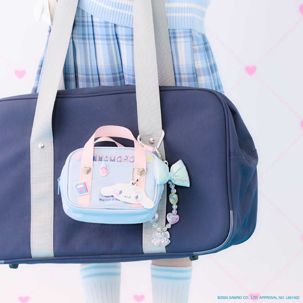 スクールバッグ風のポーチは、平成の女子高生が持つスクバのような落書きアート風刺繍と「マイメロディ」と「シナモロール」のアップリケ刺繍チャームがポイント!ハートのカラビナ付きで、バッグチャームや、背面の透明なハート窓には好きなものを入れて持ち運べるデザイン♪