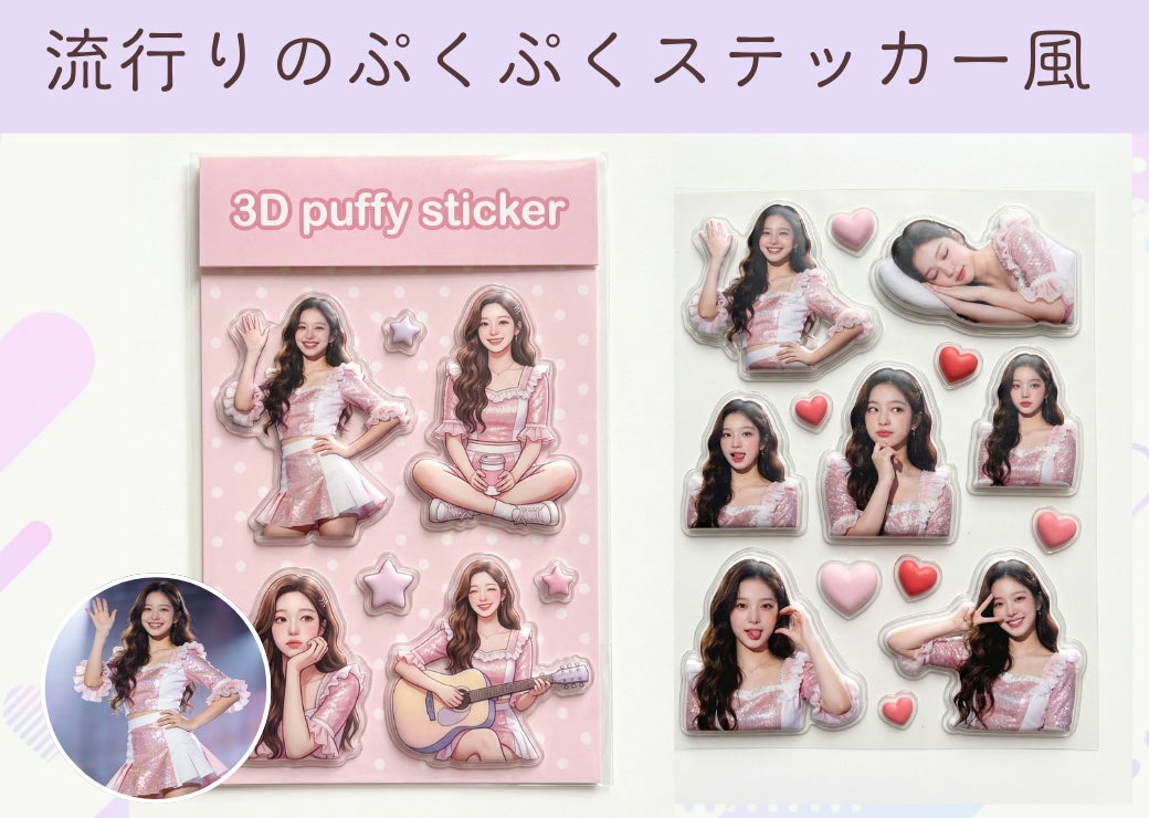 本機能の最大の特長は、推しの写真を立体感のある“ぷくぷくステッカー”として生成できるAI画像生成機能です。