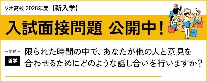 教養探究で哲学・科学・経済を学べる通信制高校・学校法人ワオ未来学園 ワオ高等学校(所在地:岡山県岡山市、校長:平田強)では、2026年度新入学入試として、3月出願の受付を2月21日(土)に開始いたします。